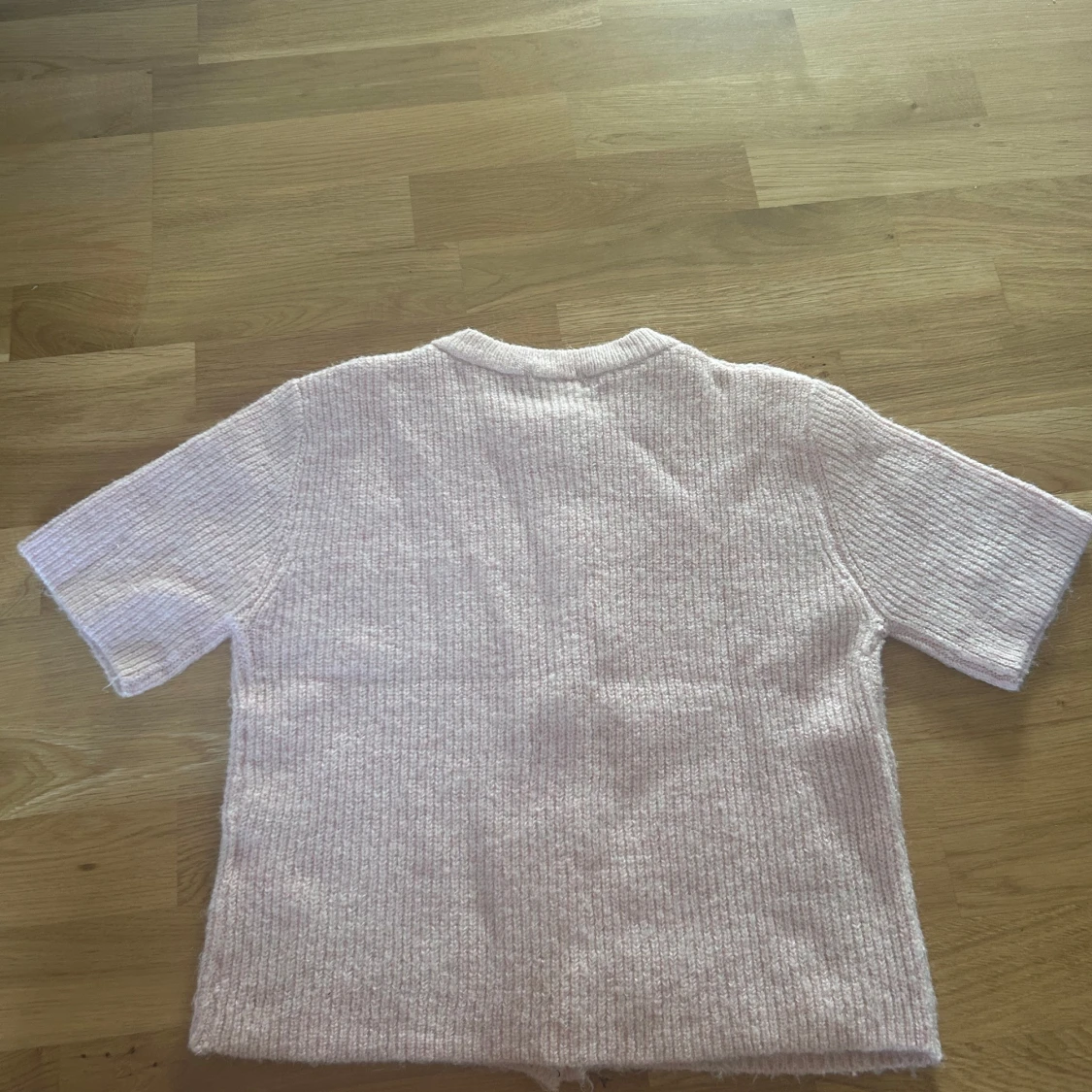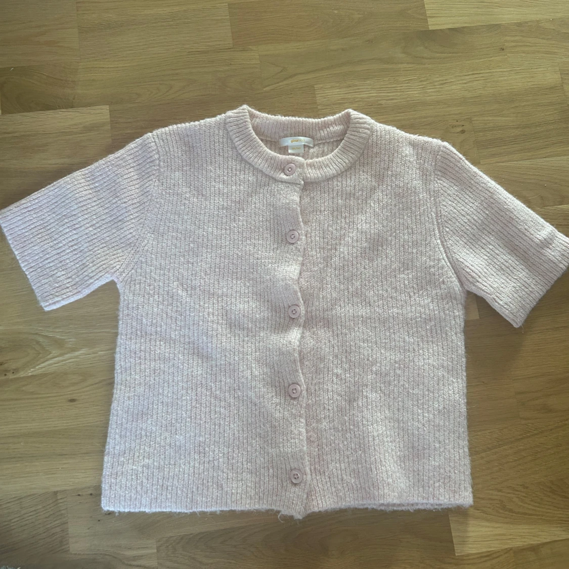 Superfin ljusrosa stickad kofta från Gina Tricot med kort ärm och rund halsringning. Koftan har ribbad struktur och stängs med fem matchande knappar framtill. Perfekt att slänga över en topp.
