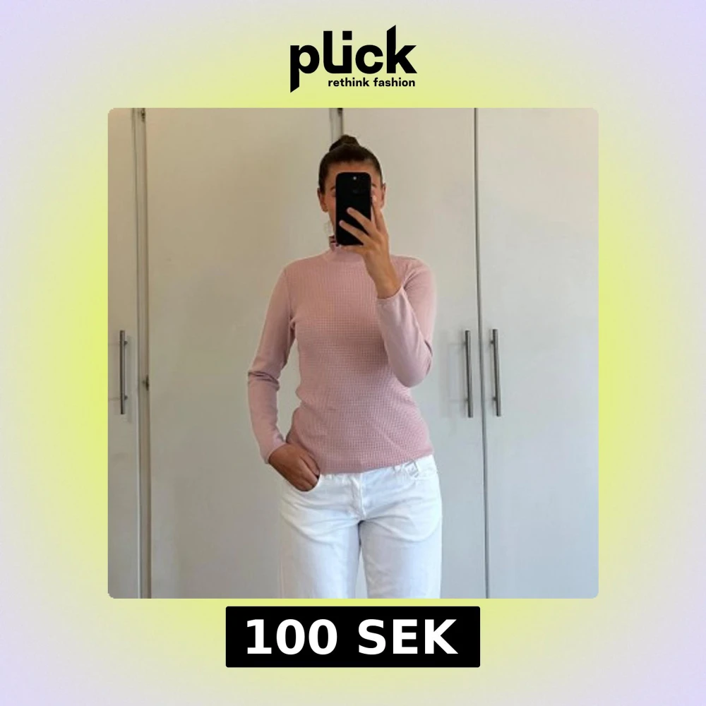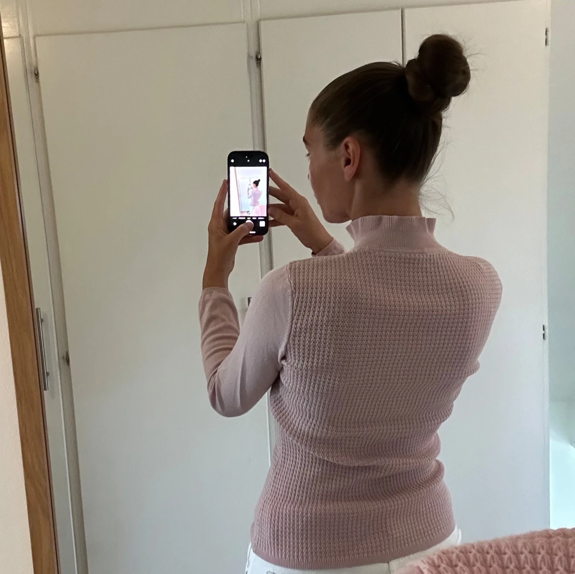 Supersöt ljusrosa stickad polotröja med ribbad, volangig krage och långärmad passform. Tröjan har ett diskret strukturerat mönster framtill och sitter tajt men bekvämt. Perfekt för lager-på-lager och ger en fräsch vibe till din outfit.