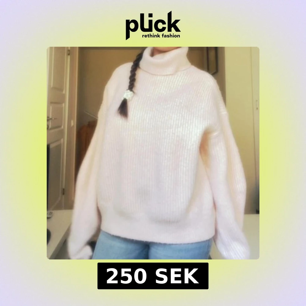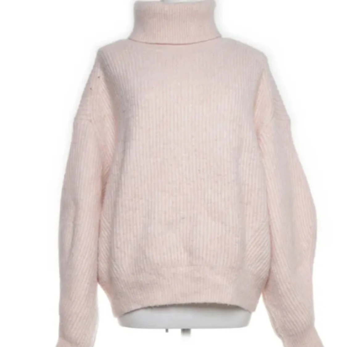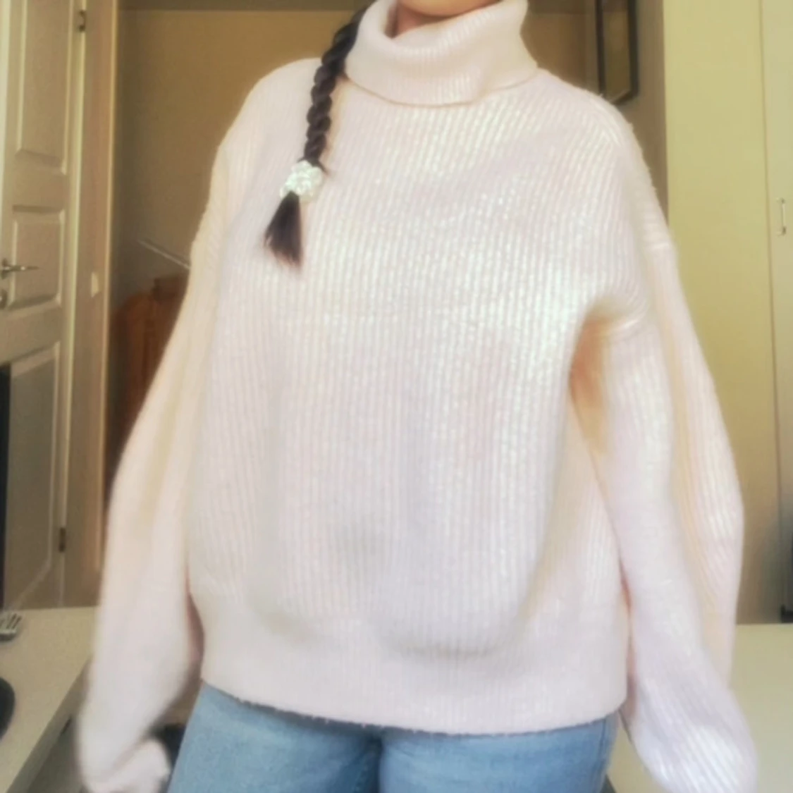 Mysig ljusrosa stickad polotröja med oversized passform och ribbad struktur. Tröjan har långa ärmar och hög polokrage, perfekt för kyliga dagar. Enkel att styla med jeans eller kjol.