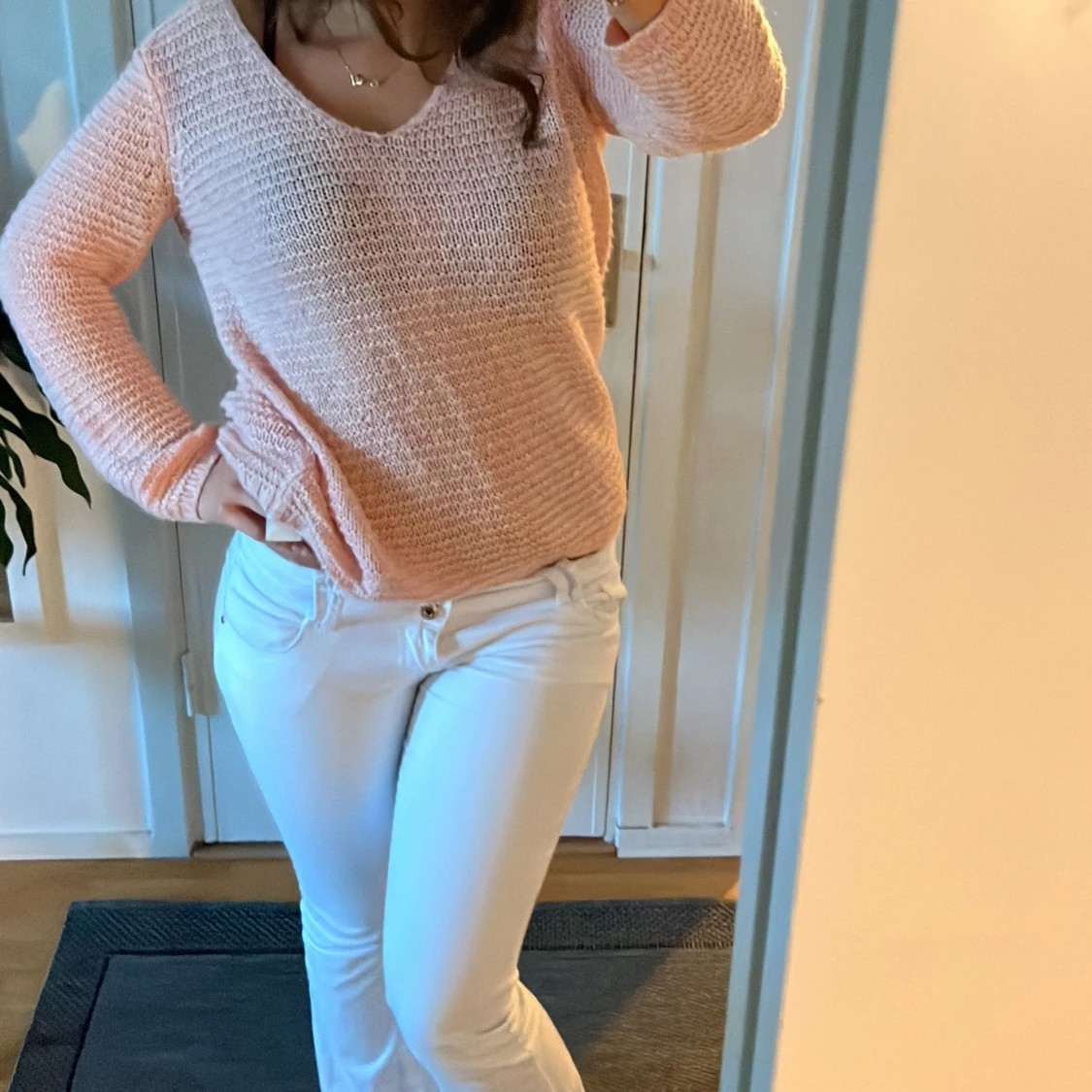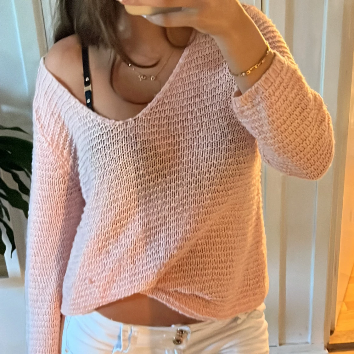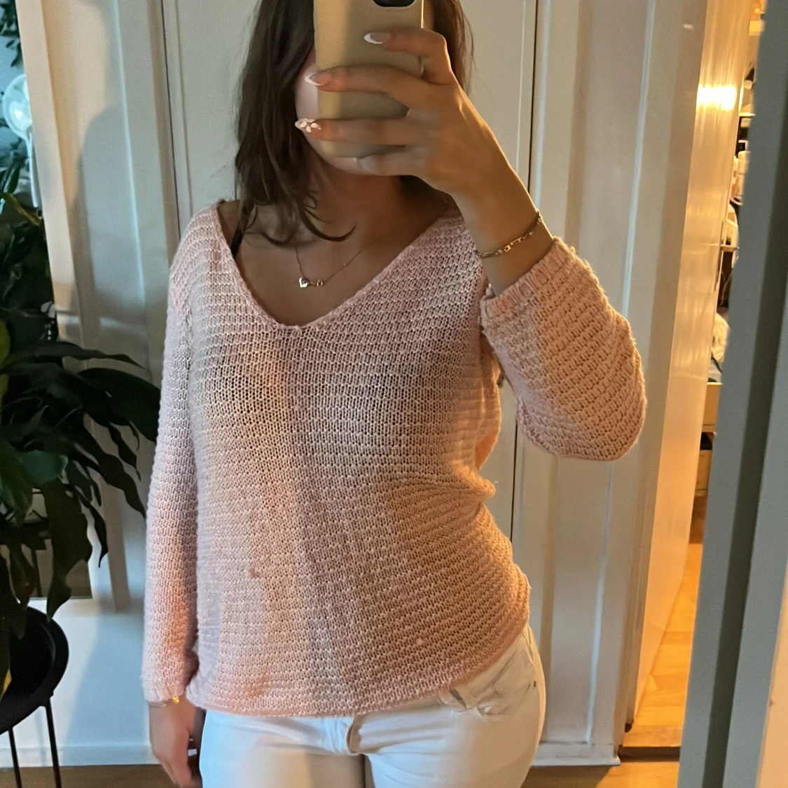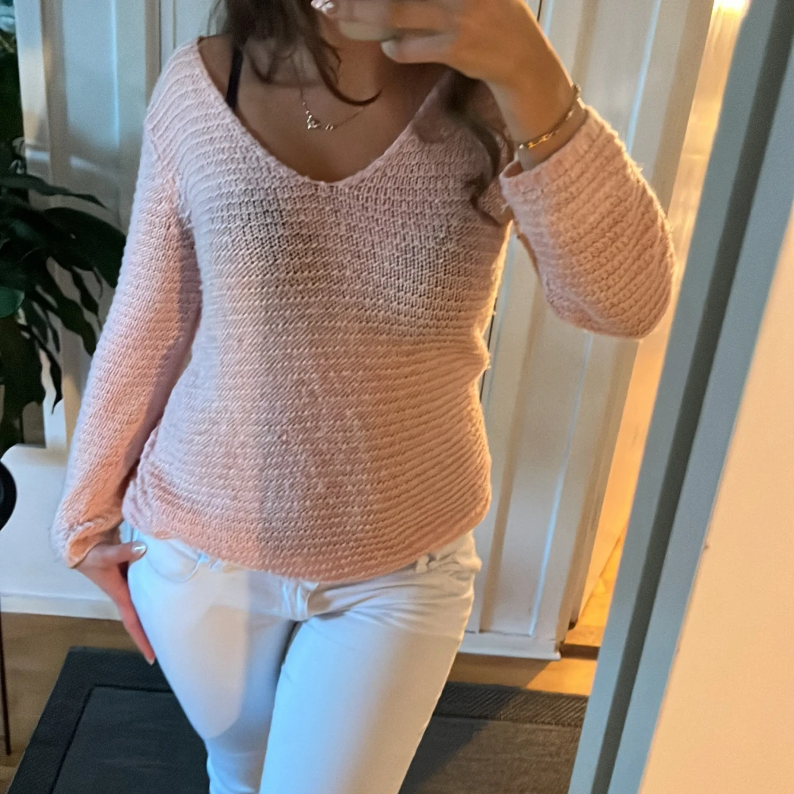 Säljer en ljusrosa stickad tröja med v-ringad hals och långärmade ärmar. Tröjan har en loose passform och är perfekt för dig som gillar en chill och avslappnad stil. Materialet är mjukt och luftigt stickat, vilket gör den skön att bära under både vår och höst.