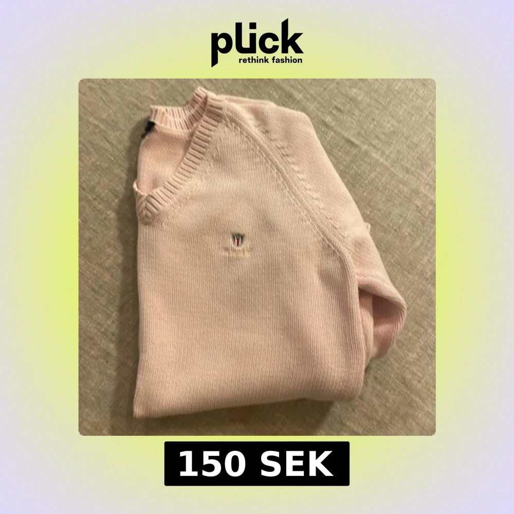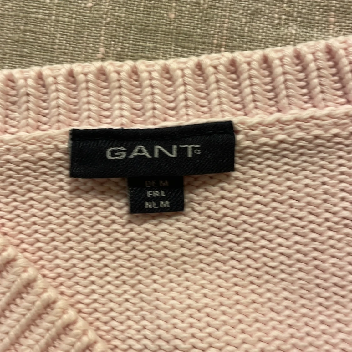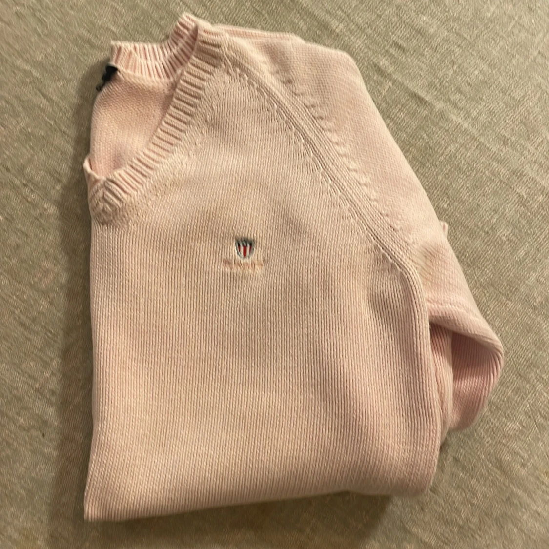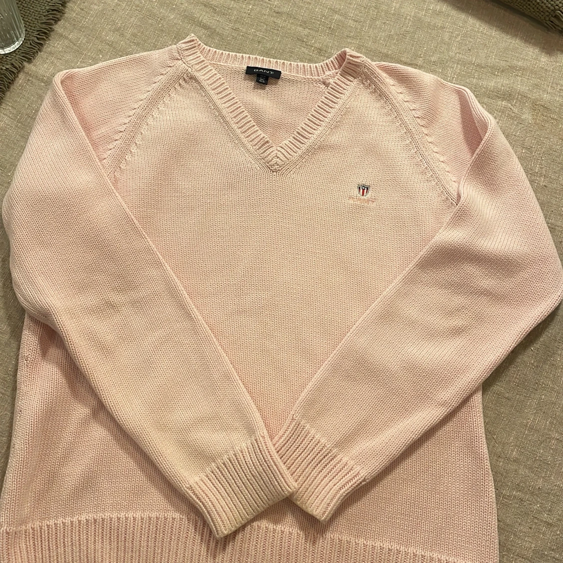 Säljer en klassisk ljusrosa stickad tröja från GANT med v-ringning och broderad logotyp på bröstet. Tröjan är i bomull, har långa ärmar och ribbade muddar vid ärmslut och nederkant.