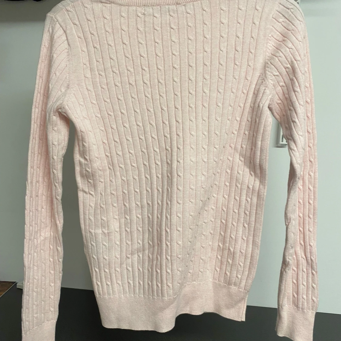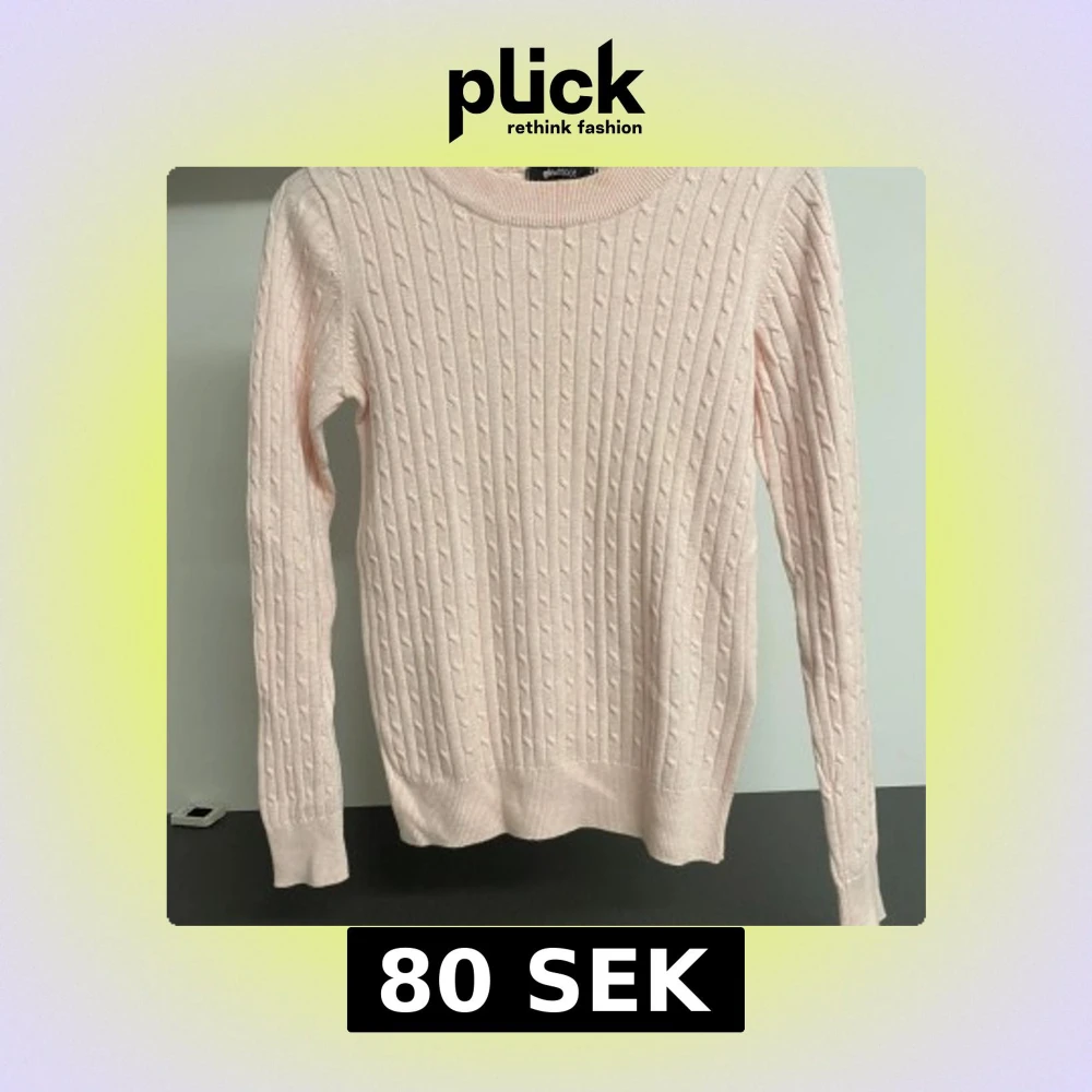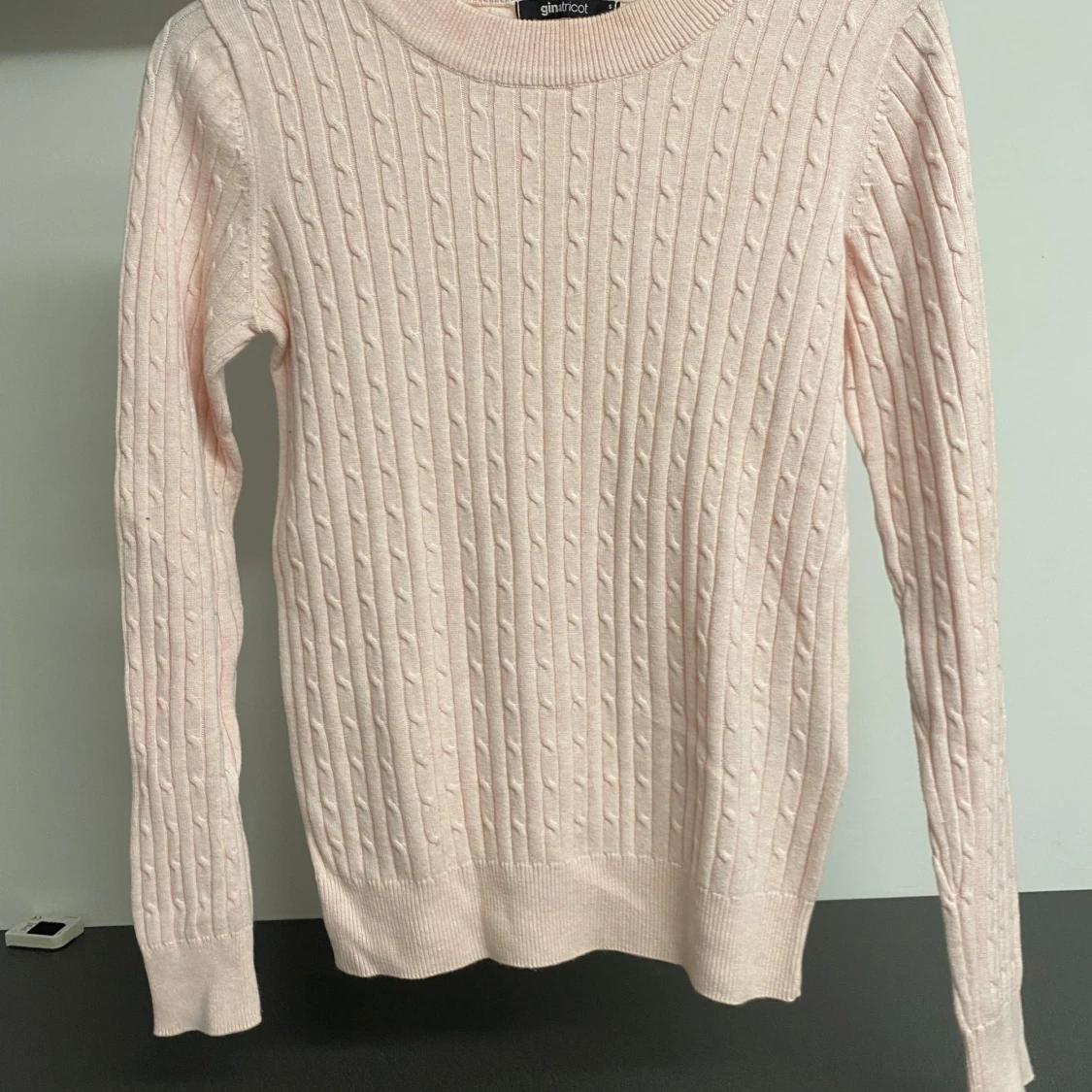 Säljer en ljusrosa stickad tröja från Gina Tricot i ekologisk bomull. Tröjan har ett klassiskt flätmönster och långa ärmar. Perfekt för en mysig dag.