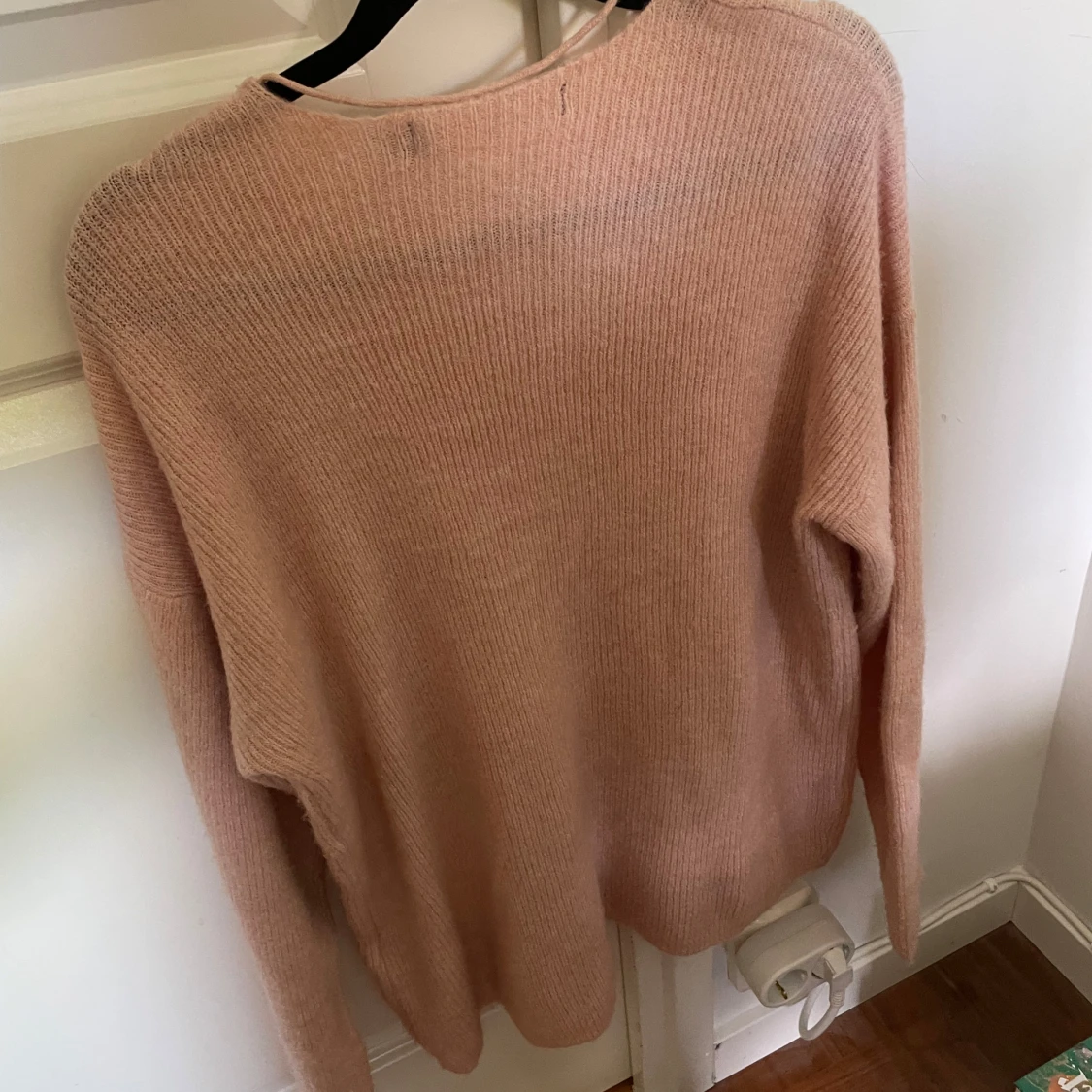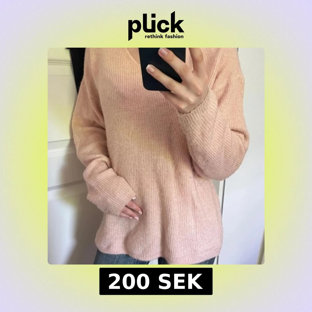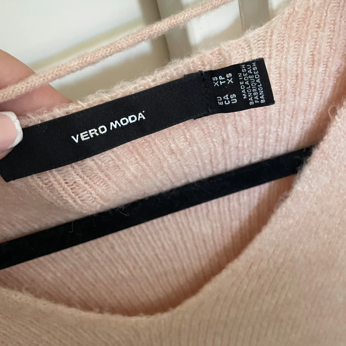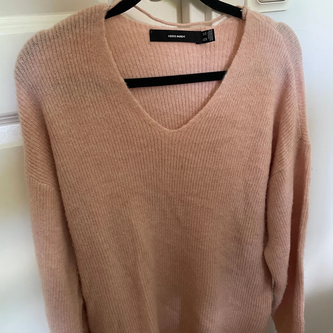Mysig ljusrosa stickad tröja från Vero Moda med v-ringad hals. Tröjan har lång ärm och en avslappnad passform, perfekt att bära till jeans eller kjol. Tröjan är ej använd.
