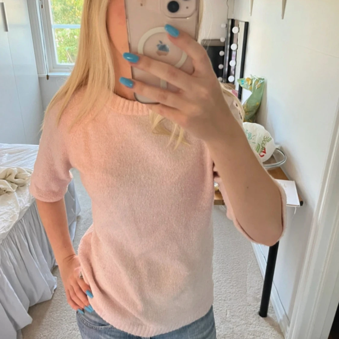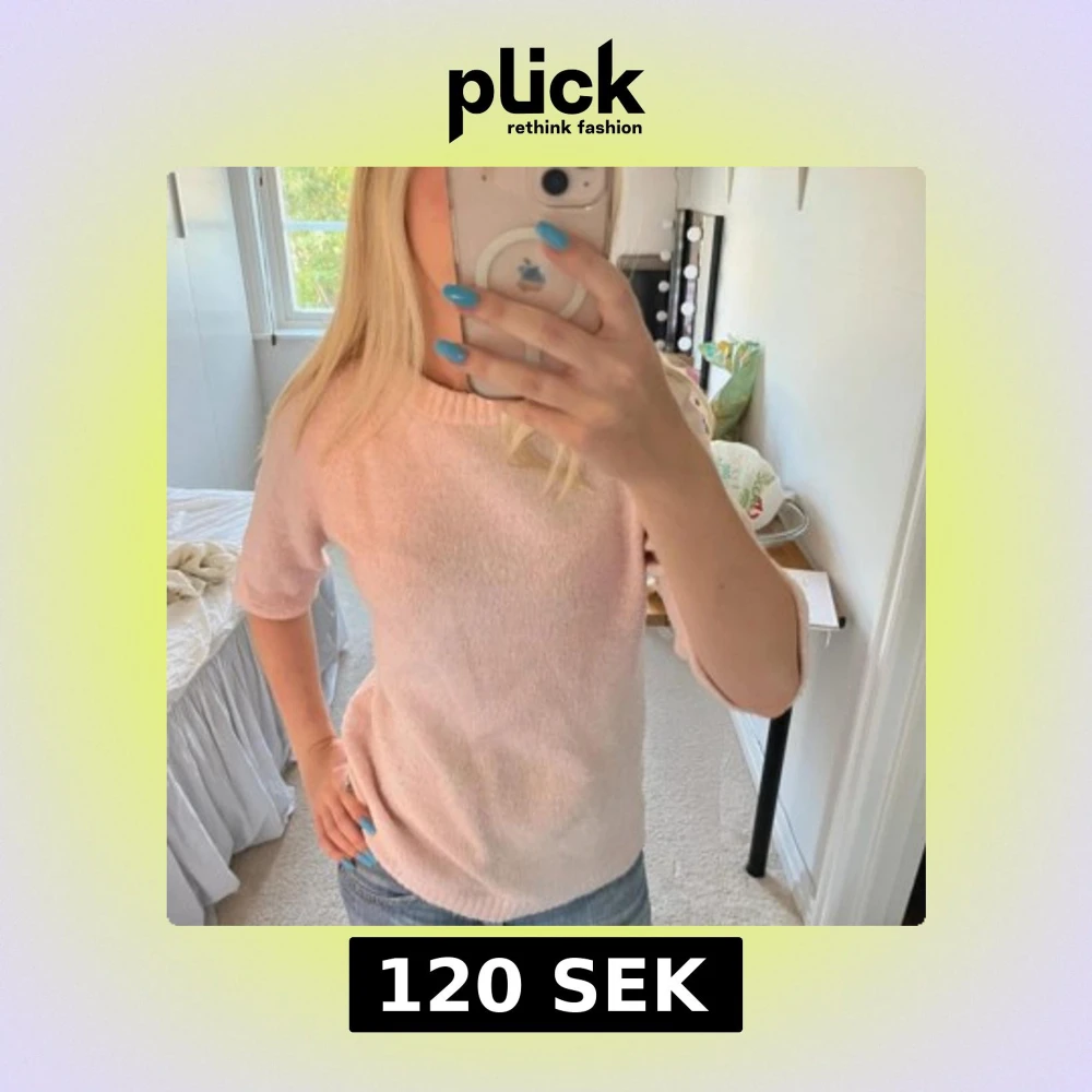 Superfin ljusrosa stickad tröja med korta ärmar och rund hals. Mjuk och skön, perfekt till våren eller svala sommarkvällar. Enkel och stilren design som är lätt att matcha med jeans eller kjol.