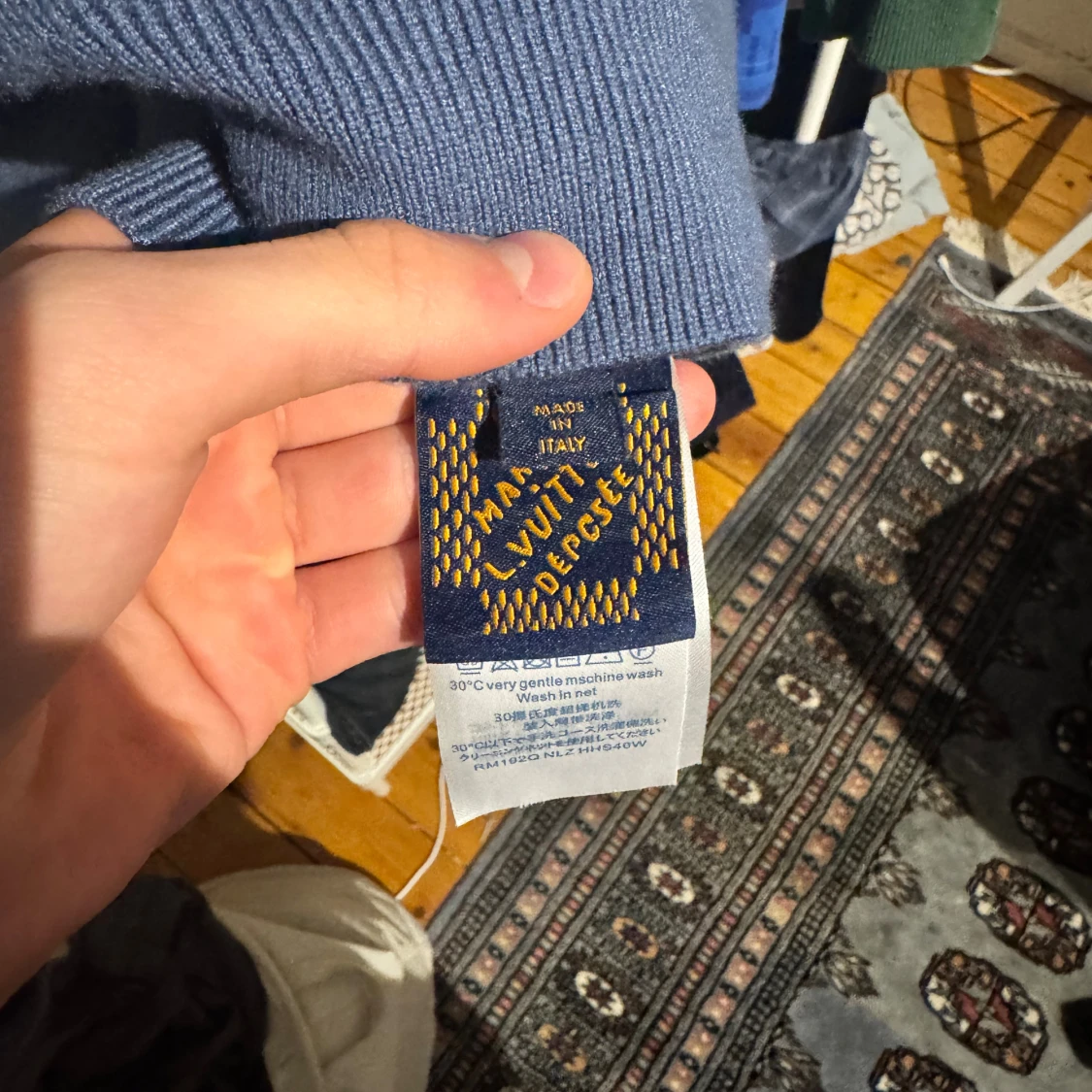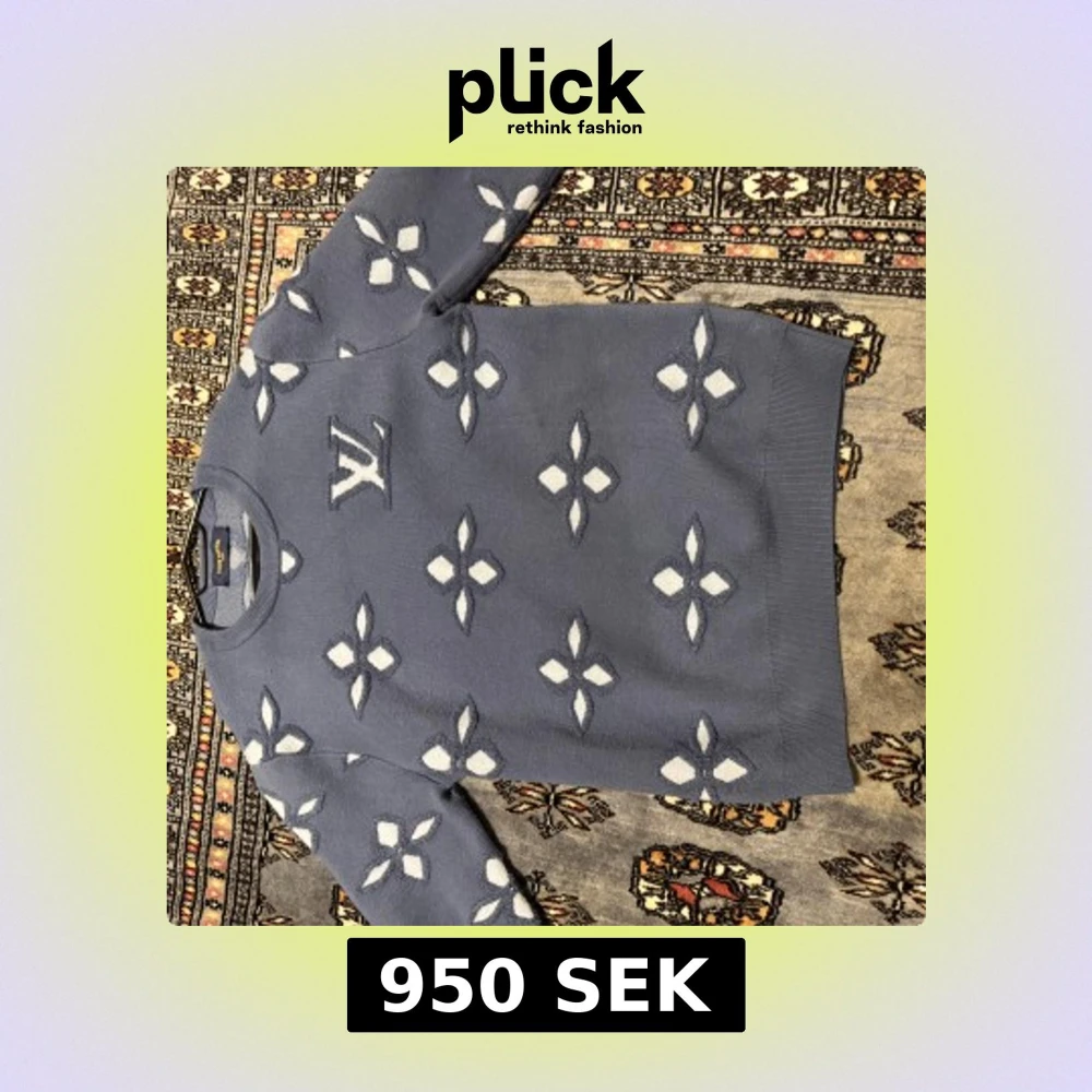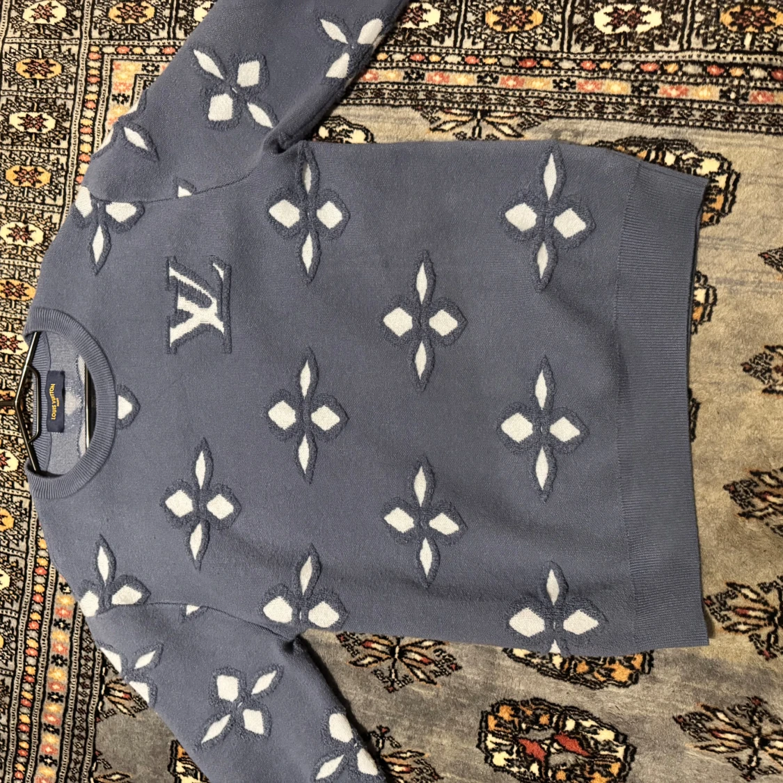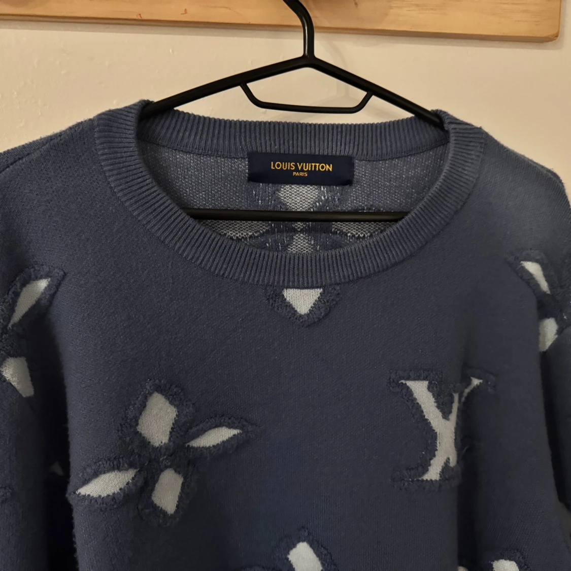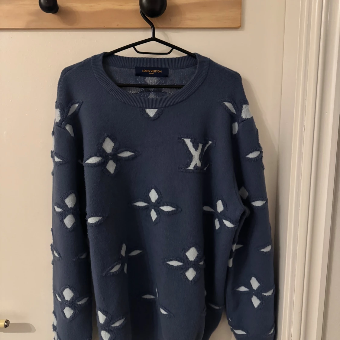Säljer en blå stickad tröja från Louis Vuitton med ikoniskt LV-mönster i vitt över hela tröjan. Tröjan har rund halsringning och långa ärmar. Perfekt statement piece för dig som vill sticka ut med lyxig streetstyle.