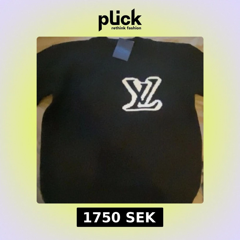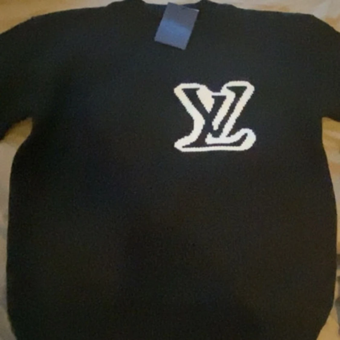 Svart stickad tröja från Louis Vuitton med stor vit LV-logga framtill. Klassisk rund halsringning och långärmad modell. Perfekt för dig som vill ha en stilren och exklusiv look med streetkänsla.