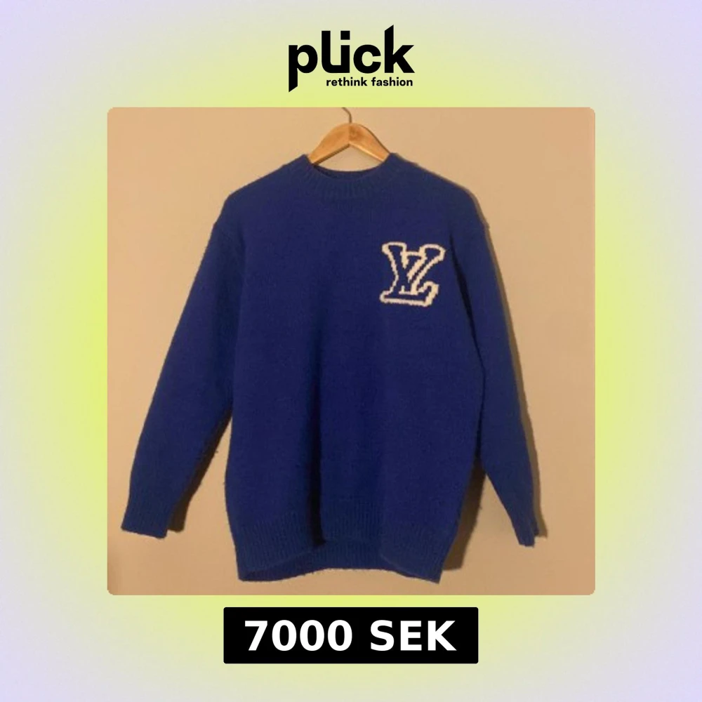 Snygg blå stickad tröja från Louis Vuitton med stort vitt LV-logo på bröstet. Tröjan har rund halsringning, ribbade muddar och är långärmad. Villig att förhandla priset. B 20/L 26