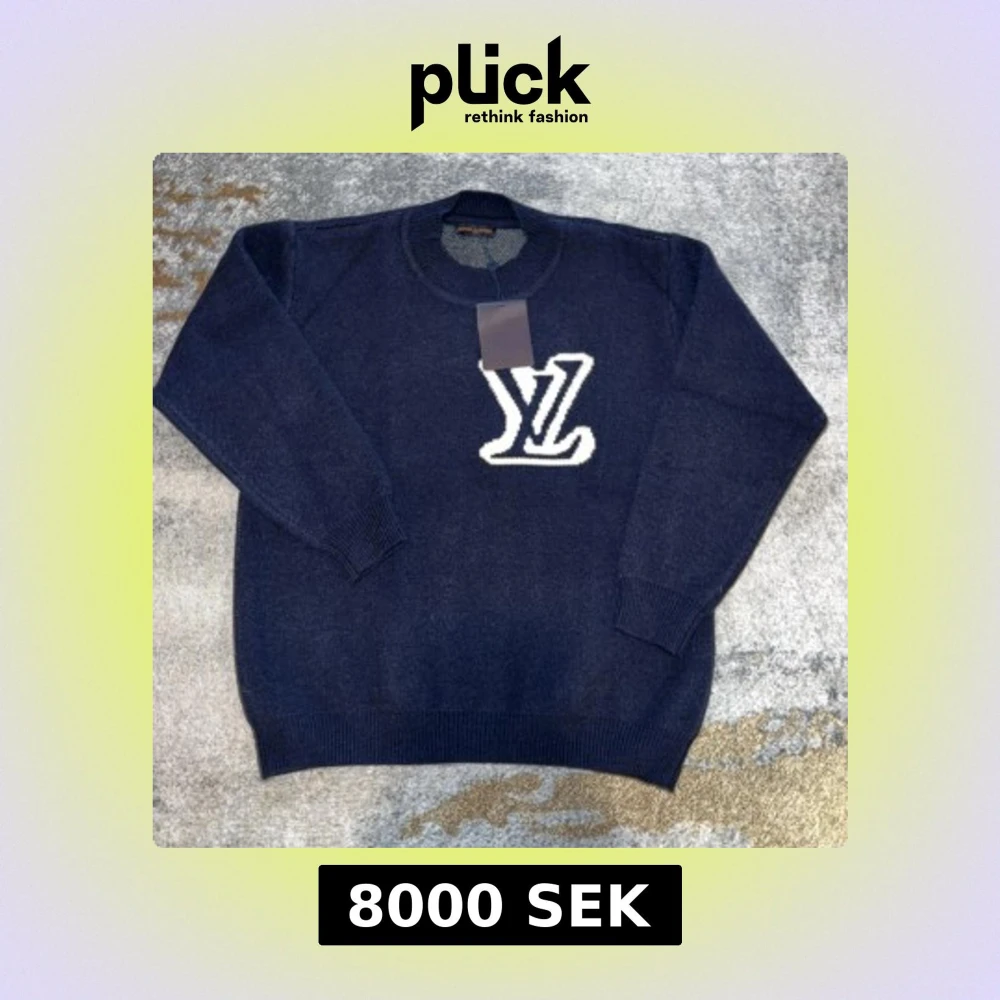 Mörkblå stickad tröja från Louis Vuitton med stort vitt LV-logo på både fram- och baksidan. Tröjan har rund halsringning, ribbade muddar och är långärmad. Perfekt för dig som vill ha en lyxig och stilren look.