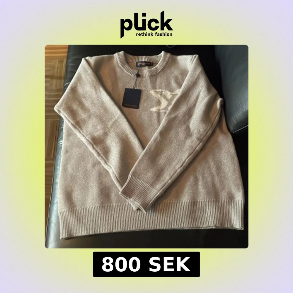 Exklusiv beige stickad tröja från Louis Vuitton med stort LV-logo i vitt på bröstet. Tröjan har rund halsringning, ribbade muddar och lång ärm. Perfekt för dig som vill ha en stilren och lyxig look med en touch av designer.