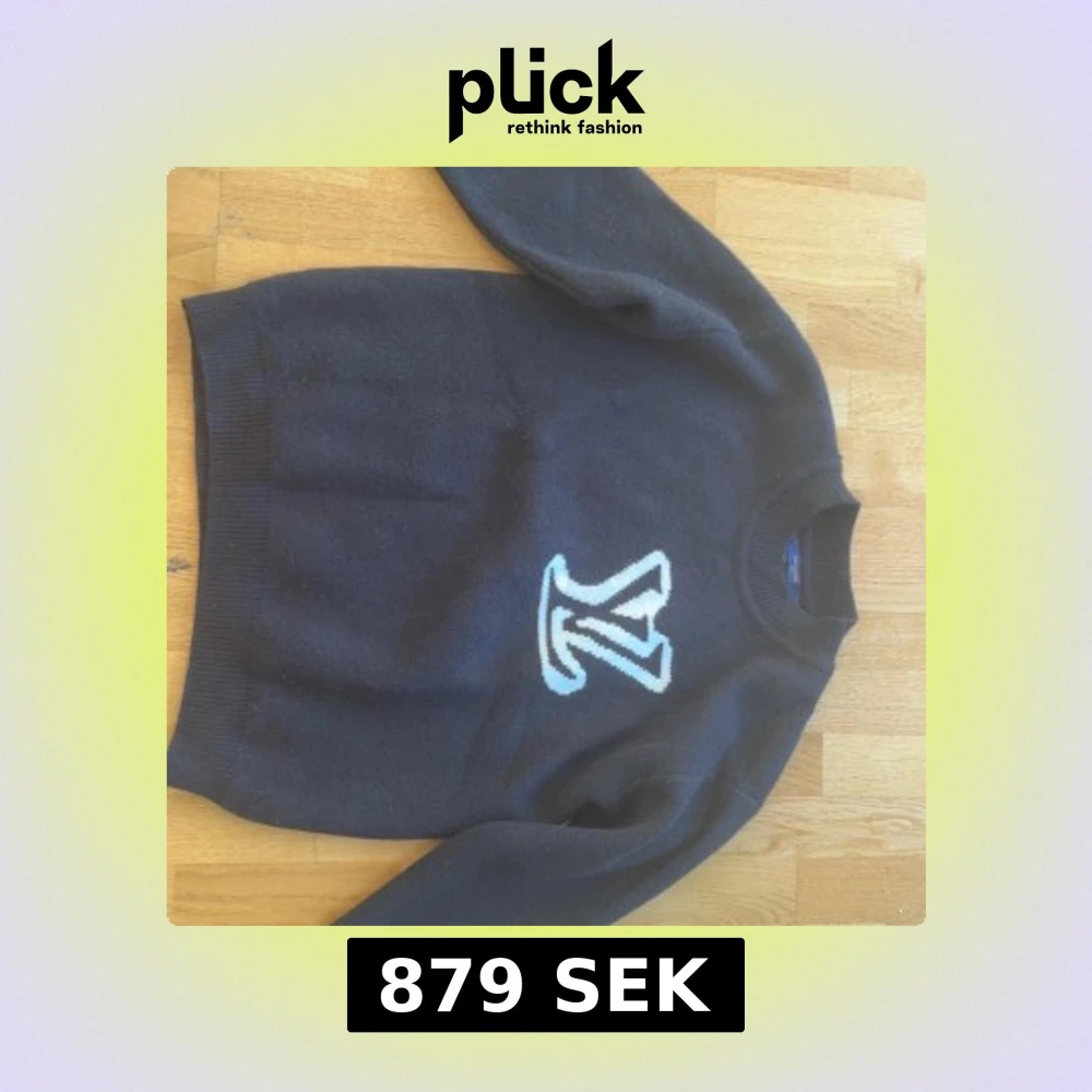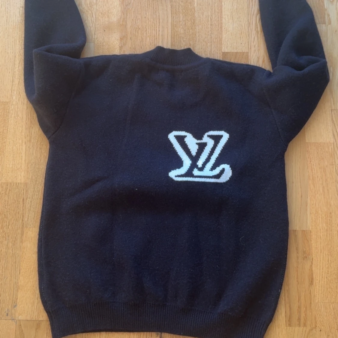 Snygg svart stickad tröja från Louis Vuitton med stort LV-logo i vitt och blått framtill. Tröjan har rund halsringning och långa ärmar, perfekt för dig som vill ha en klassisk men ändå trendig look.