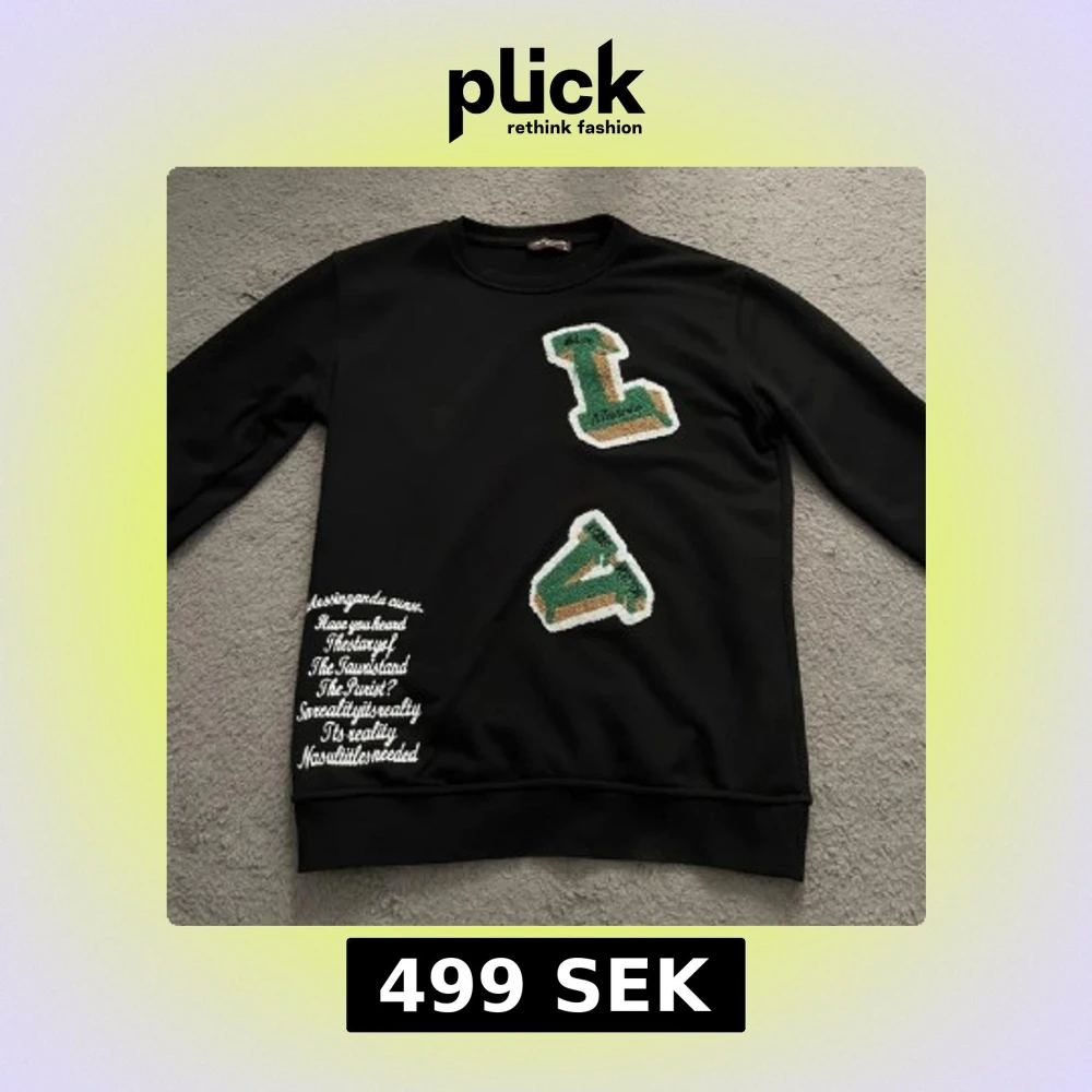 Svart sweatshirt med långa ärmar och coola broderade bokstäver i grönt, vitt och gult framtill. Tryckt vit text på ena sidan nedtill. Klassisk rund halsringning och mjukt material, perfekt för en avslappnad stil.