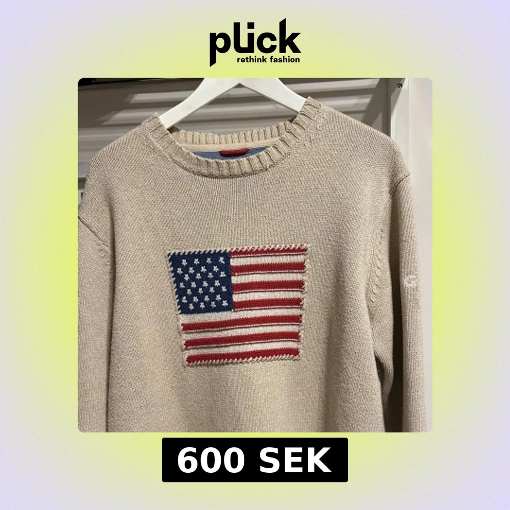 Säljer en snygg beige stickad tröja från GANT med ett amerikanskt flaggmotiv på framsidan. Tröjan har en rund halsringning och är tillverkad i 100% bomull. Perfekt för en avslappnad stil.