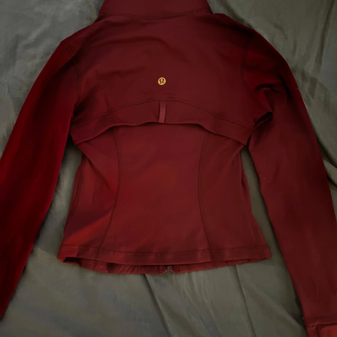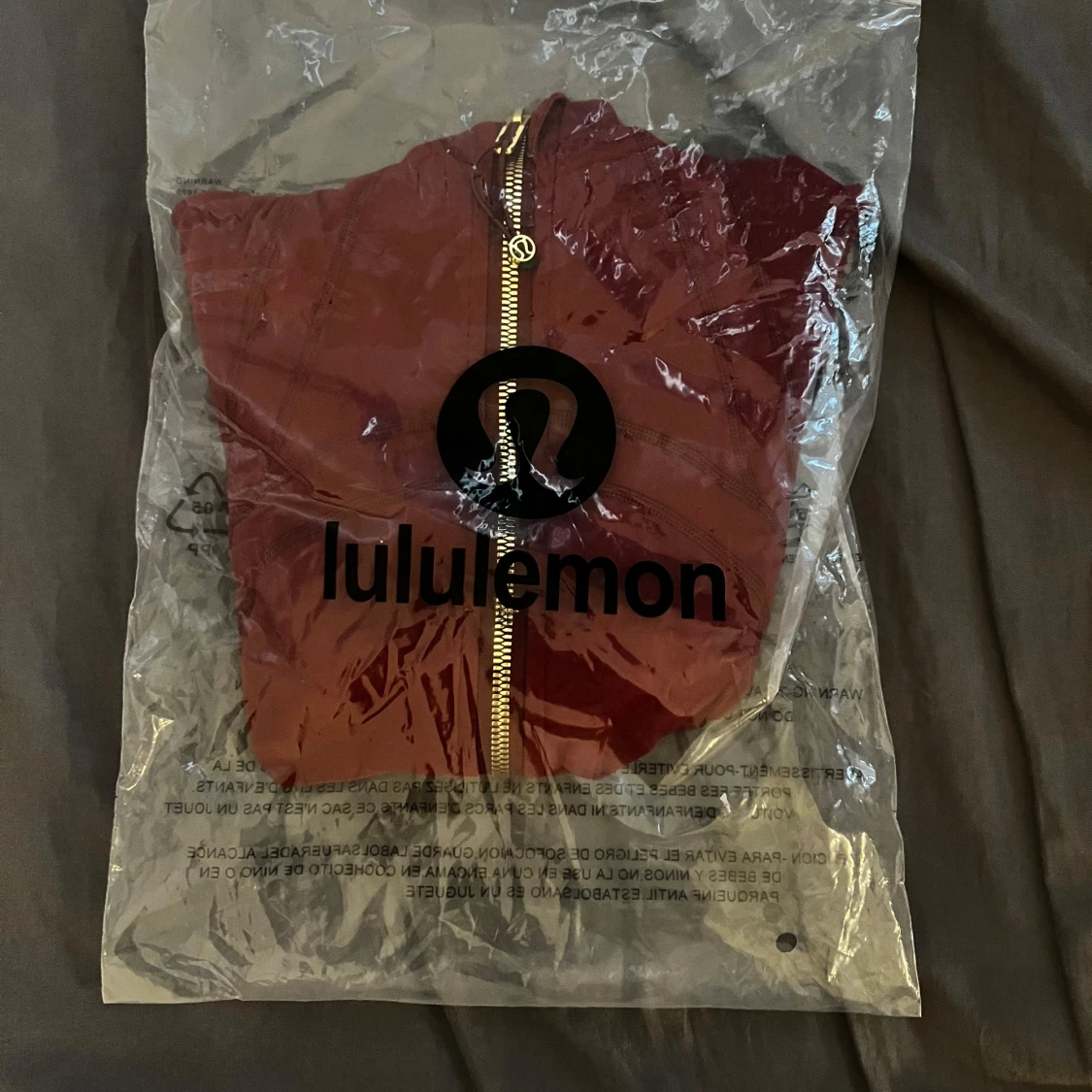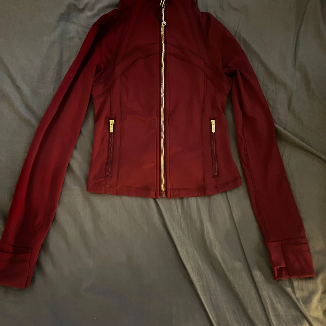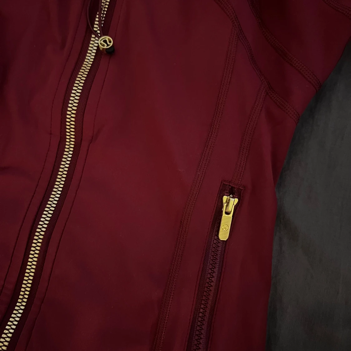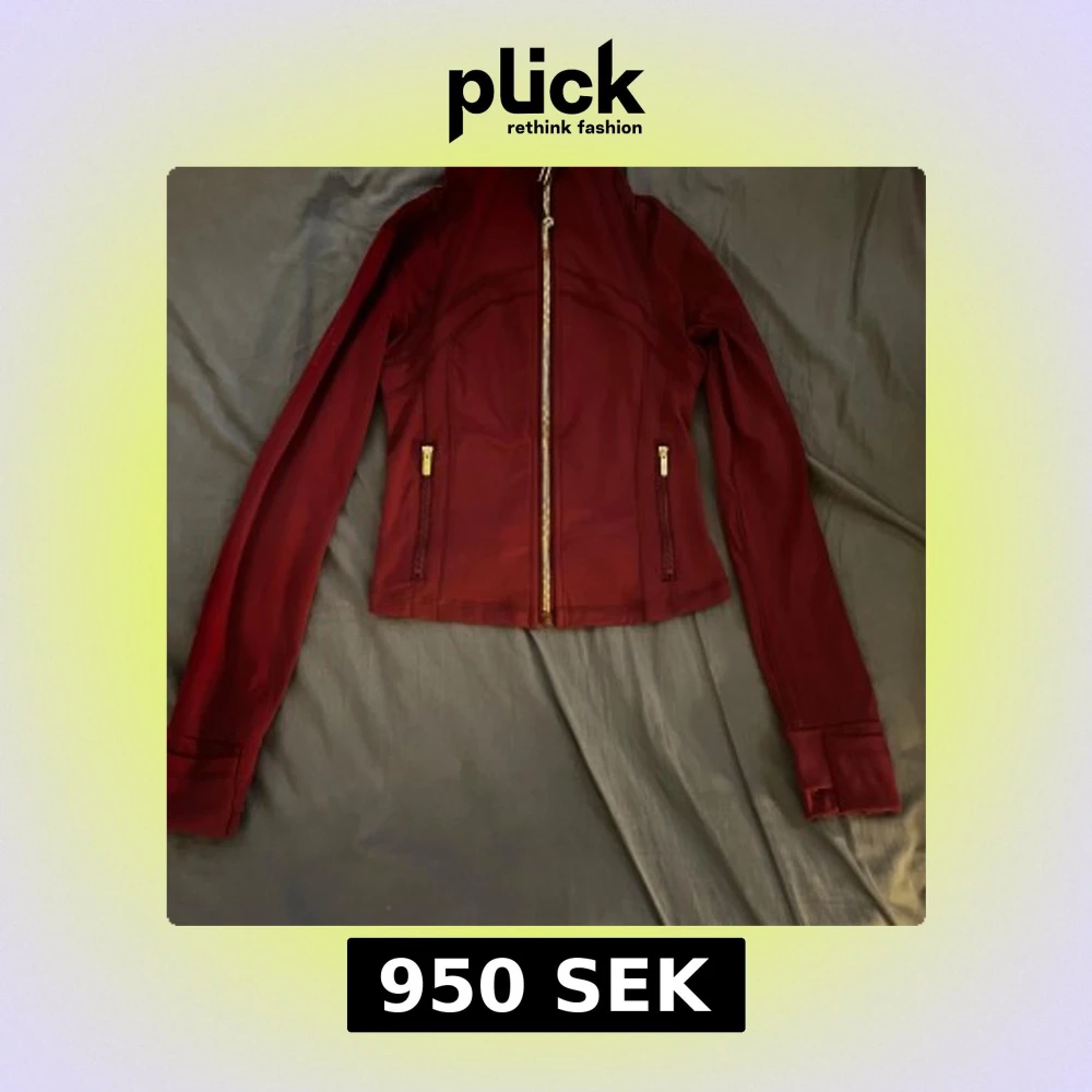 Snygg vinröd jacka från Lululemon med guldiga dragkedjor och figurnära passform. Storlek XS-S. En gammal model, förmodligen har det funnits ett begränsat antal av den.