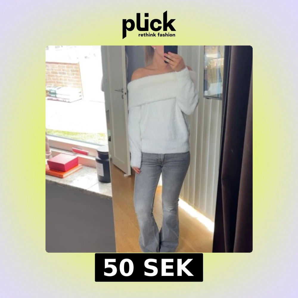 Säljer en supermjuk och fluffig vit stickad tröja med offshoulder-modell. Så mysig!!