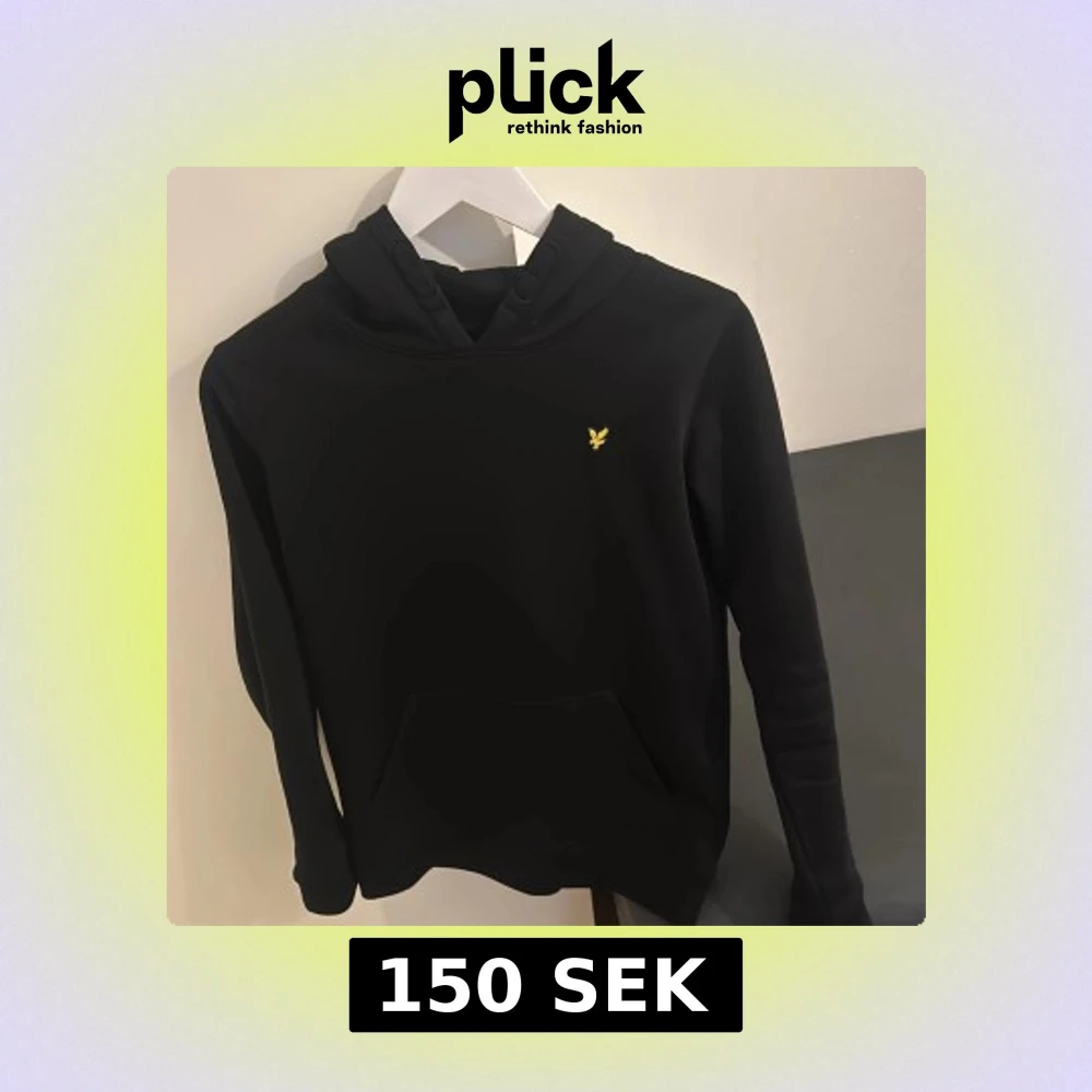 Säljer en stilren svart hoodie från Lyle & Scott med deras ikoniska gula logga på bröstet. Tröjan har en klassisk design med huva och långa ärmar, perfekt för en avslappnad look. Passar ungdomar i åldern 12-13 år.