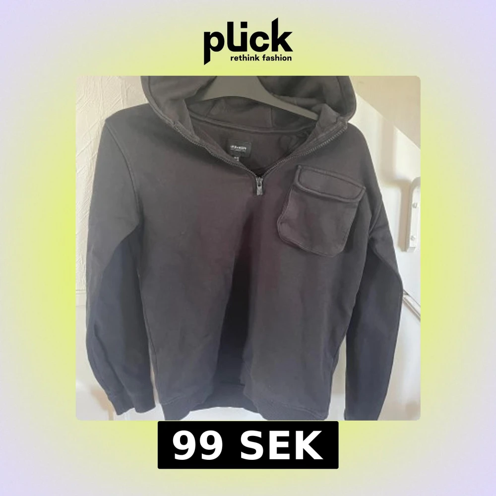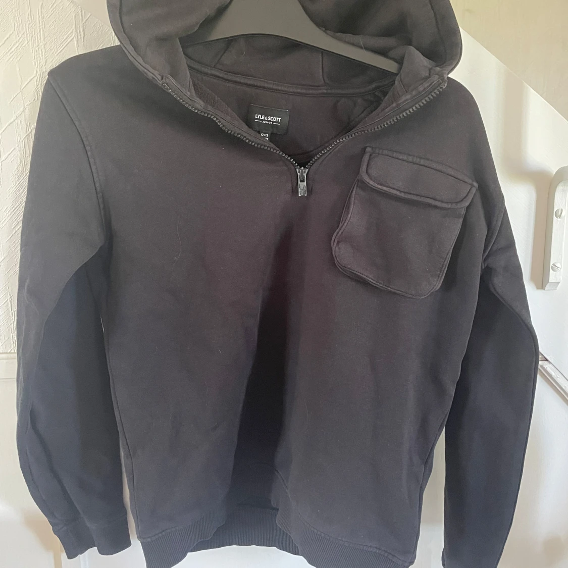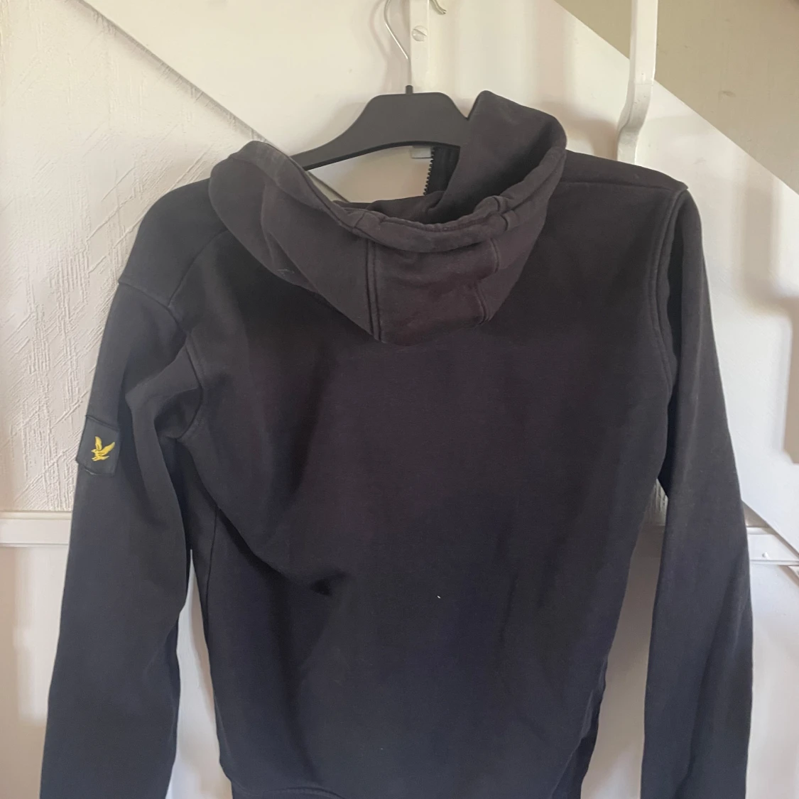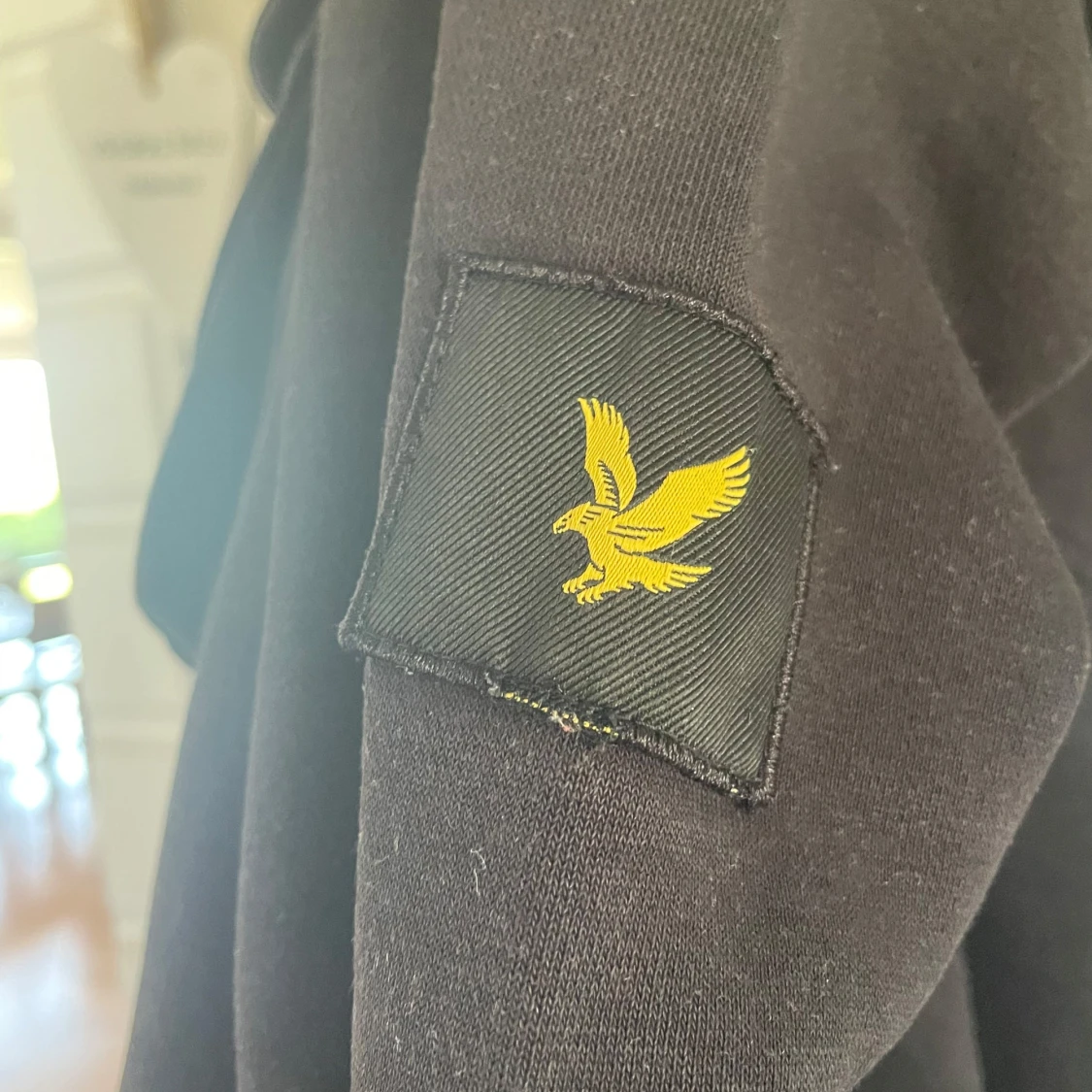 Svart hoodie från Lyle & Scott med dragkedja vid halsen och en bröstficka. Klassisk gul logga på ärmen. Mjuk bomullskänsla och ribbade muddar vid ärmslut och nederkant. Perfekt för en avslappnad stil.