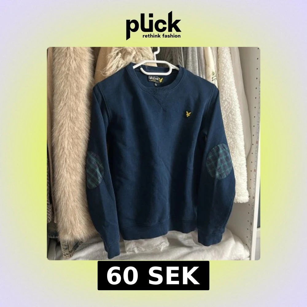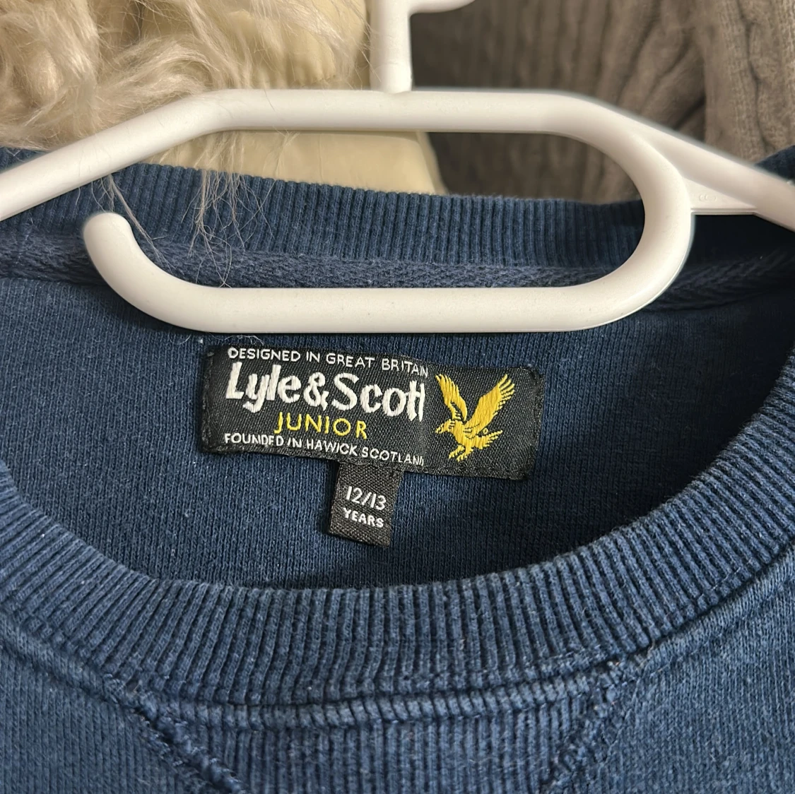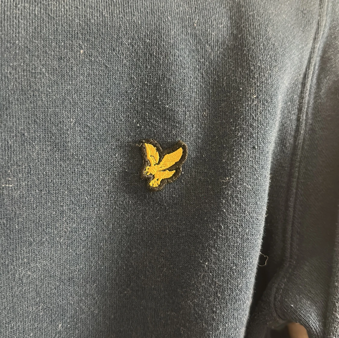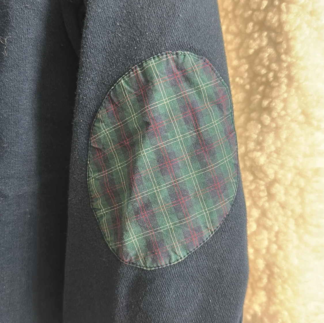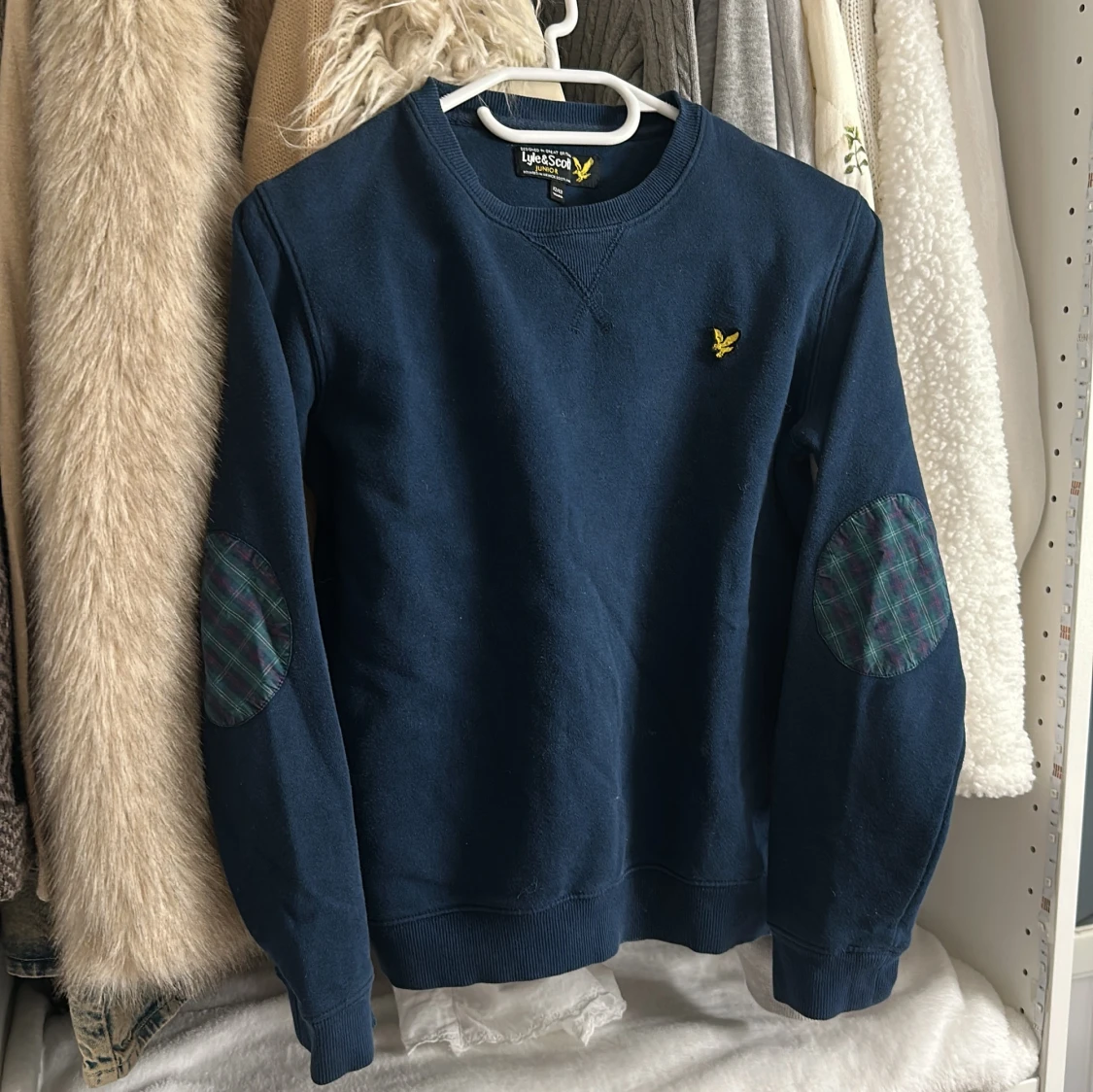 Mörkblå sweatshirt från Lyle & Scott med broderad gul logga på bröstet och rutiga armbågslappar i grönt och rött. Tröjan har rund hals och långa ärmar, perfekt för en chill och stilren look.