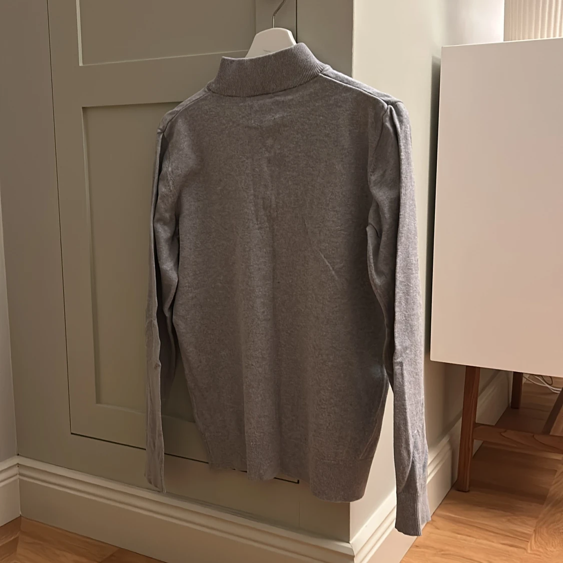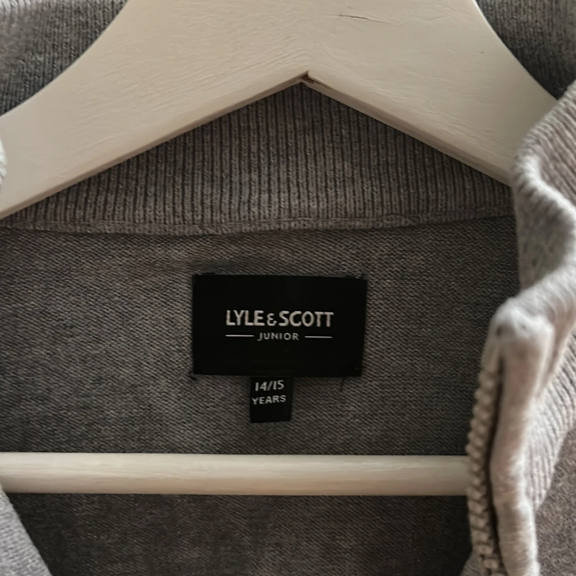 Grå långärmad tröja från Lyle & Scott Junior med half zip och ståkrage. Tröjan har ett litet broderat gult logomärke på bröstet och är tillverkad i mjuk bomull. Perfekt för chill dagar och snygg till jeans eller joggers. OBS: liten röd fläck på ryggen, syns inte vid andvändning.
