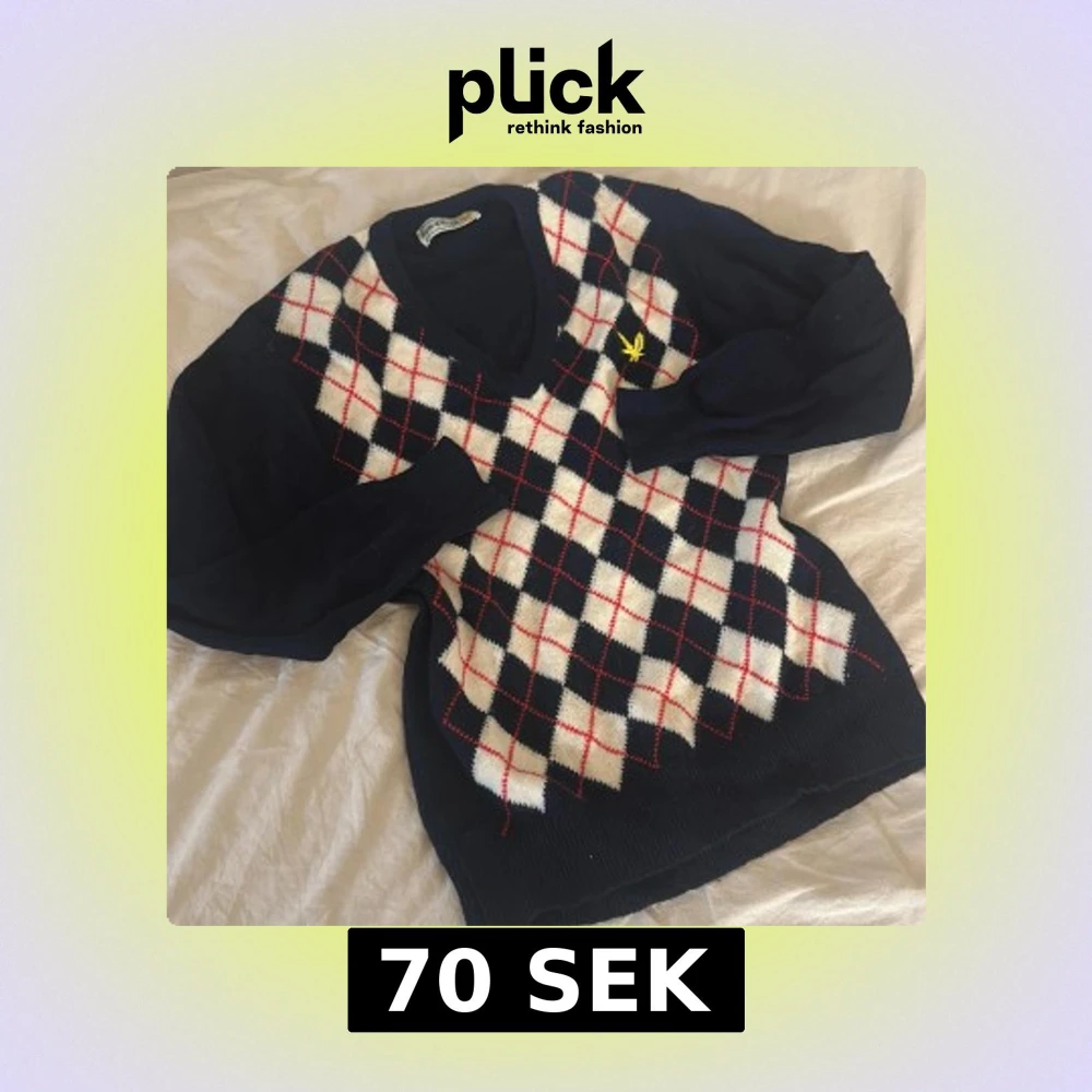 Snygg mörkblå stickad tröja från Lyle & Scott i 100% lammull. Framsidan har klassiskt argylemönster i vitt, mörkblått och rött samt den ikoniska gula fågeln broderad på bröstet. V-ringad med långa ärmar och ribbade muddar.