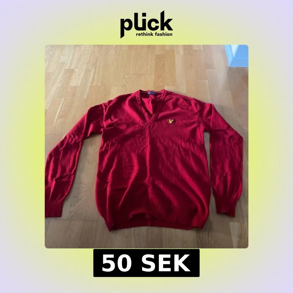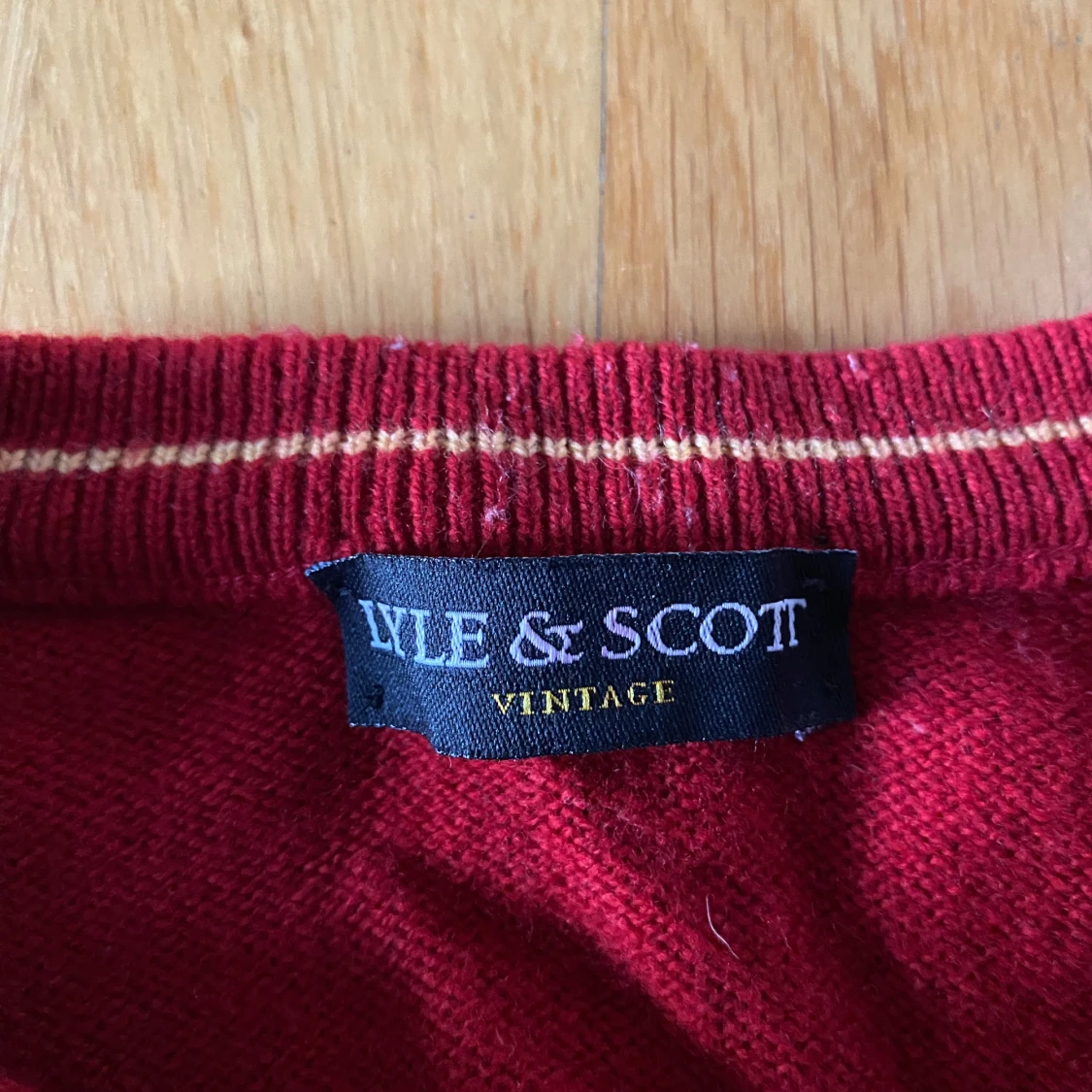 Röd v-ringad tröja från Lyle & Scott Vintage med broderad gul logga på bröstet. Tröjan är långärmad och har ribbade muddar vid ärmslut och nederkant. Perfekt för dig som gillar klassisk stil med en färgstark touch.