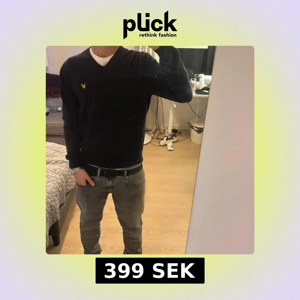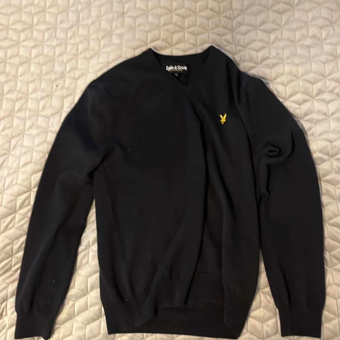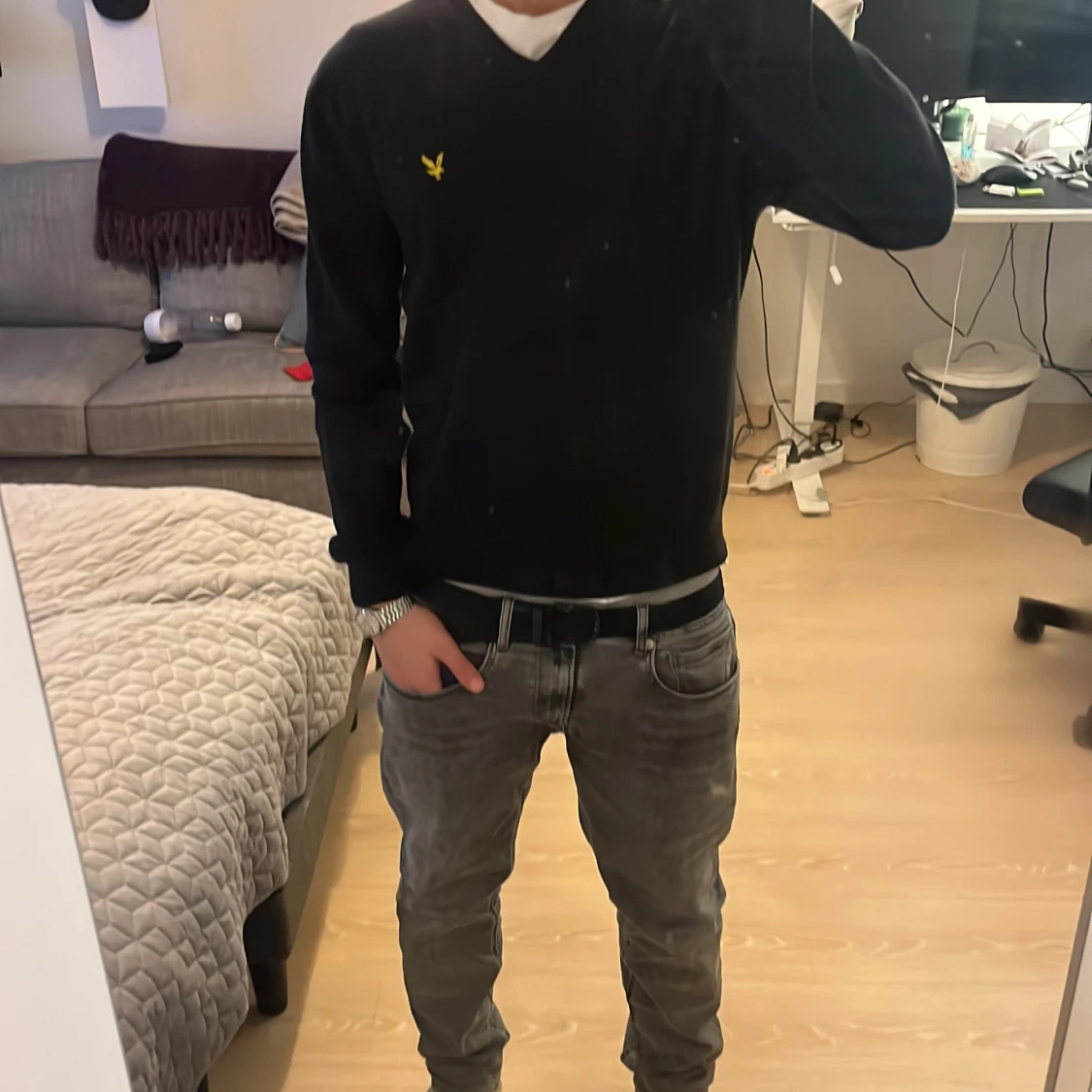Säljer en stilren svart tröja från Lyle & Scott med v-ringning och deras ikoniska logga på bröstet. Perfekt för en avslappnad men ändå snygg look. Passar bra till jeans eller chinos. Skriv till mig vid minsta fundering eller fler bilder. Jag är själv 182cm och väger ungefär 65 kg. Det är en L i barnstorlekar vilket motsvarar S i herrstorlekar.