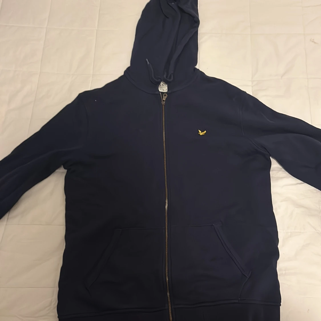 Säljer en mörkblå hoodie från Lyle & Scott med dragkedja och huva. Tröjan är ett bra skick och allt funkar som det ska