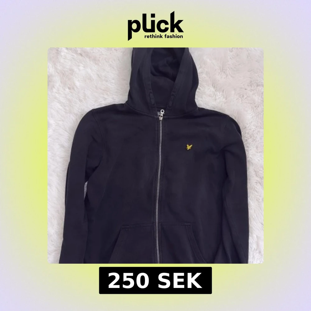 Svart hoodie från Lyle & Scott med dragkedja och klassisk gul logga på bröstet. Tröjan har huva med snörning och två fickor framtill. Perfekt för chill dagar eller när du vill ha en enkel och stilren look. Aldrig använd!