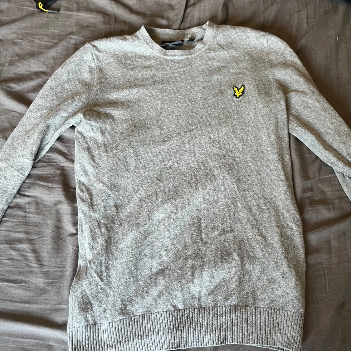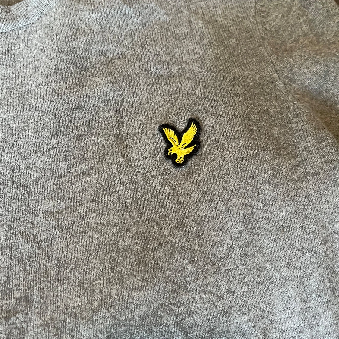 Snygg grå stickad tröja från Lyle & Scott med klassisk rund hals och deras ikoniska gula fågel-logga broderad på bröstet. Tröjan har långa ärmar och ribbade muddar för en clean look. Perfekt för lager-på-lager under hösten och vintern. Pris ej hugget i sten vid snabb affär. hör av dig vid minsta fundering!