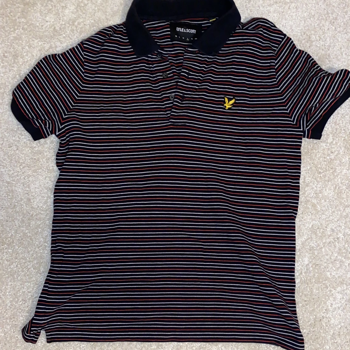 Snygg randig pikétröja från Lyle & Scott med klassisk krage och knappar. Tröjan har en broderad logga i gult på bröstet och korta ärmar. Perfekt för en avslappnad stil.