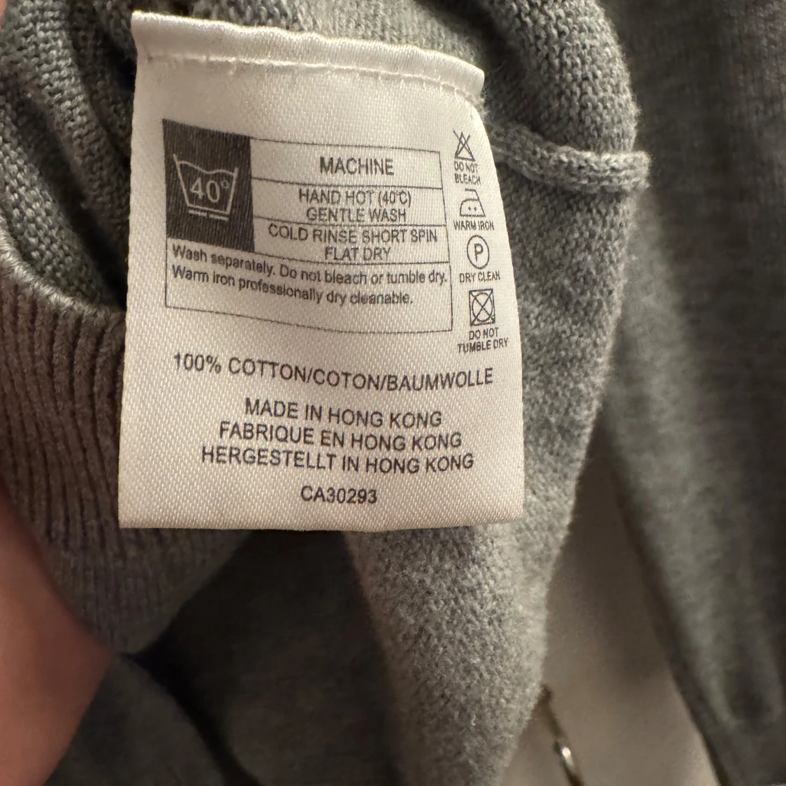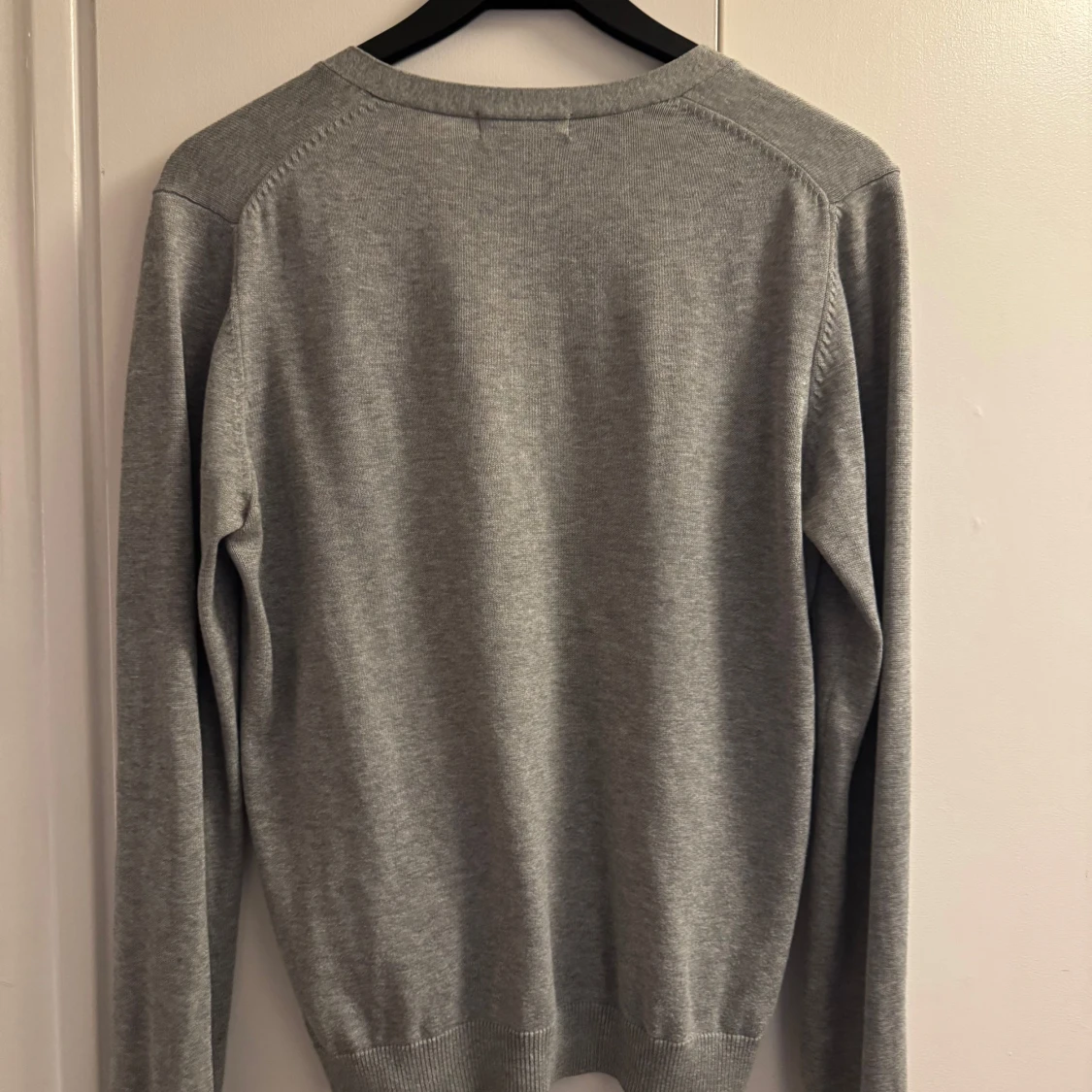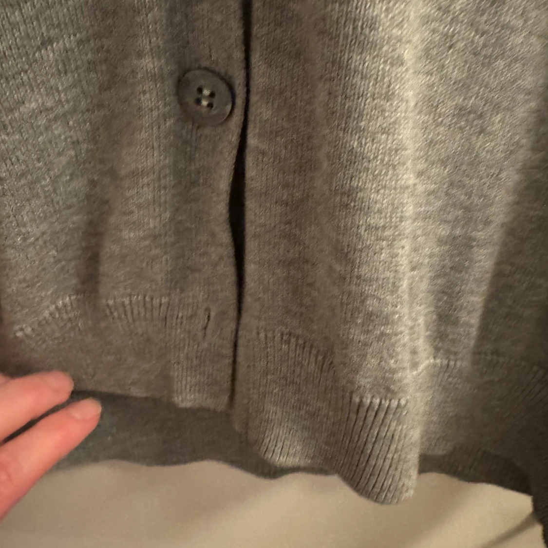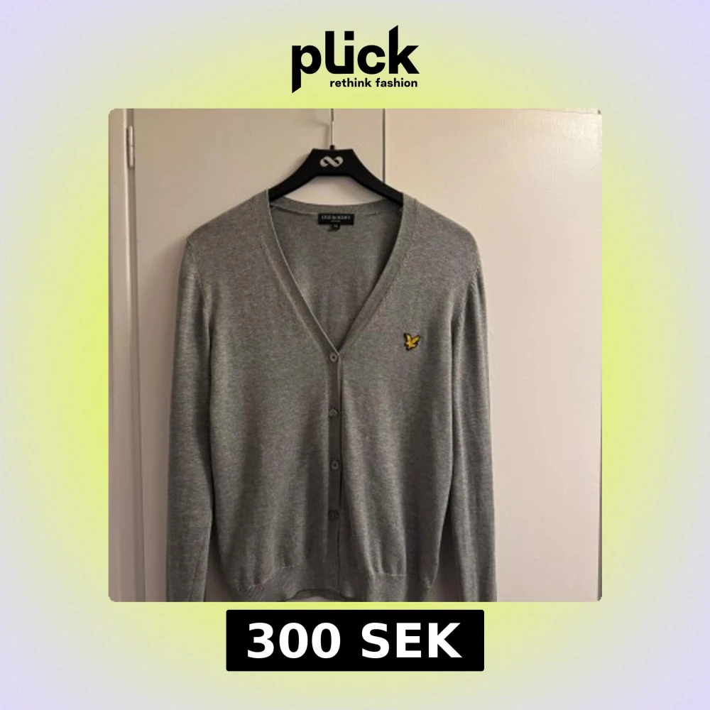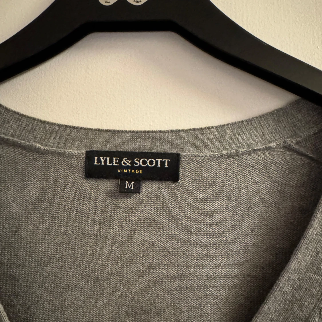 Säljer en stilren grå kofta från Lyle & Scott med v-ringning och knappar framtill. Den har ett broderat emblem på bröstet. Nedersta knappen har ramlat av.