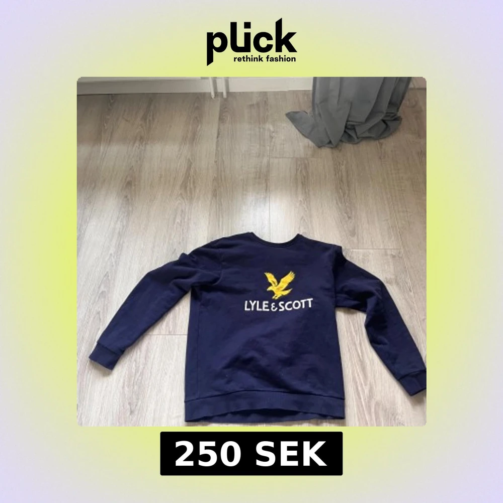 Säljer en mörkblå sweatshirt från Lyle & Scott med stor gul broderad örn och vit logga på bröstet. Tröjan har rund hals, långa ärmar och ribbade muddar. Perfekt för dig som gillar klassisk streetstyle och vill ha något bekvämt och snyggt.