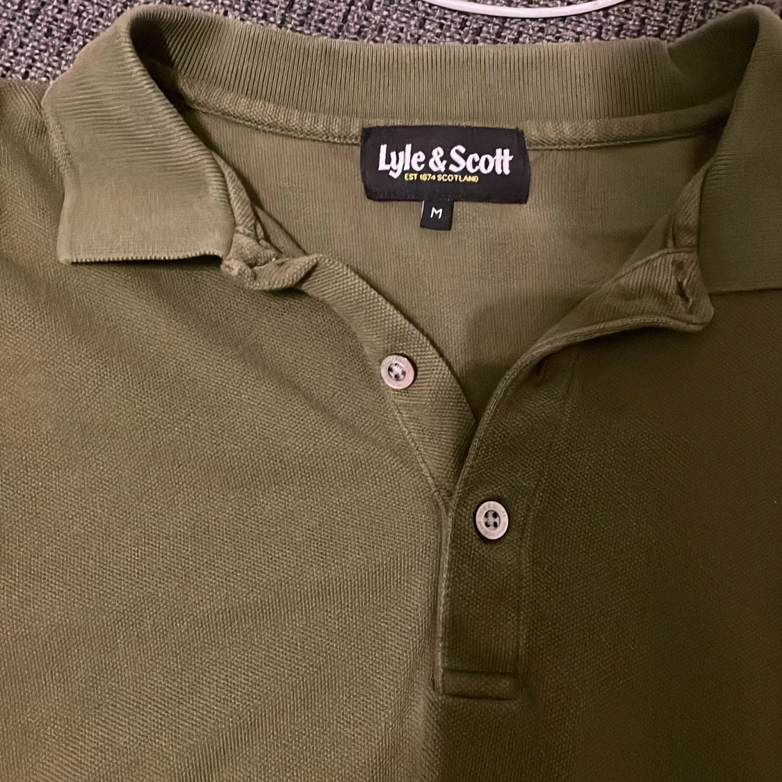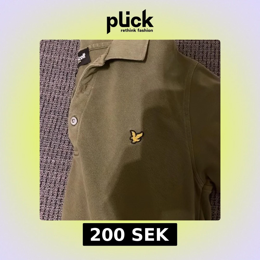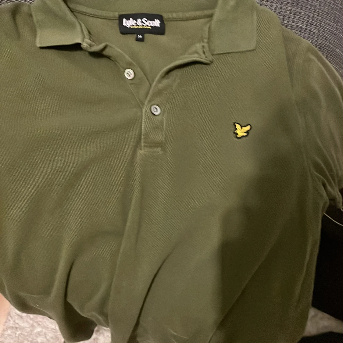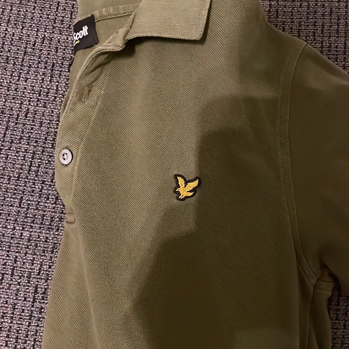 Säljer en olivgrön pikétröja från Lyle & Scott med klassisk krage och två knappar framtill. Tröjan har det ikoniska gula fågelmärket broderat på bröstet och är gjord i mjuk bomull. Perfekt för dig som gillar stilren och enkel design.