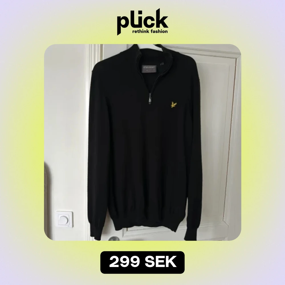 Svart 1/4 zip från Lyle&Scott i storlek M. Materialet består av 48% merinoull så den är väldigt bekväm att ha på sig. Använt den 3 gånger tror jag så den är verkligen i nyskick