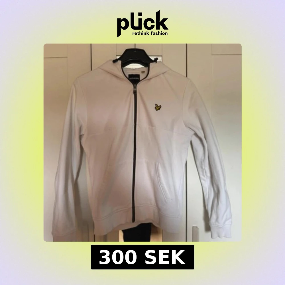 Säljer en fräsch vit hoodie från Lyle & Scott med dragkedja och huva. Tröjan har ett broderat gult fågelmärke på bröstet, långa ärmar och praktiska fickor framtill. Perfekt för chill dagar eller när du vill ha en clean look.