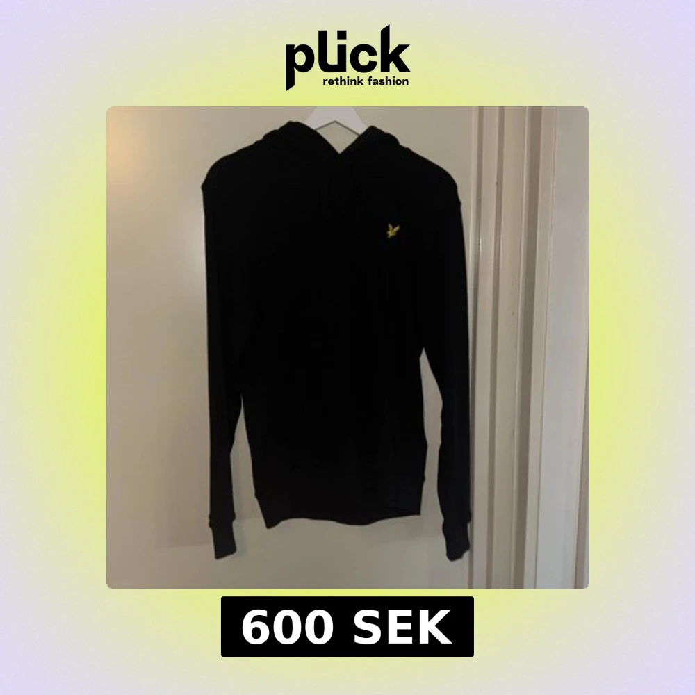 Svart hoodie från Lyle & Scott med klassisk gul logga på bröstet. Tröjan har huva med snörning och långa ärmar. Tillverkad i mjuk bomull, perfekt för en chill och stilren look. Storlek S och använd 1 gång inga defekter!