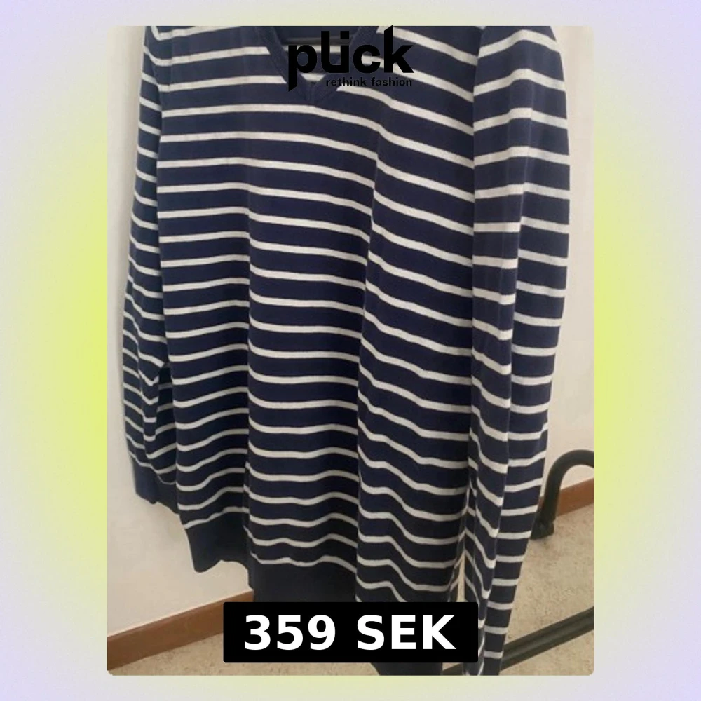 Snygg marinblå tröja med vita horisontella ränder och V-ringad hals. Tröjan har långa ärmar och ribbade muddar vid ärmslut och nederkant. Perfekt för dig som gillar klassisk och avslappnad stil.