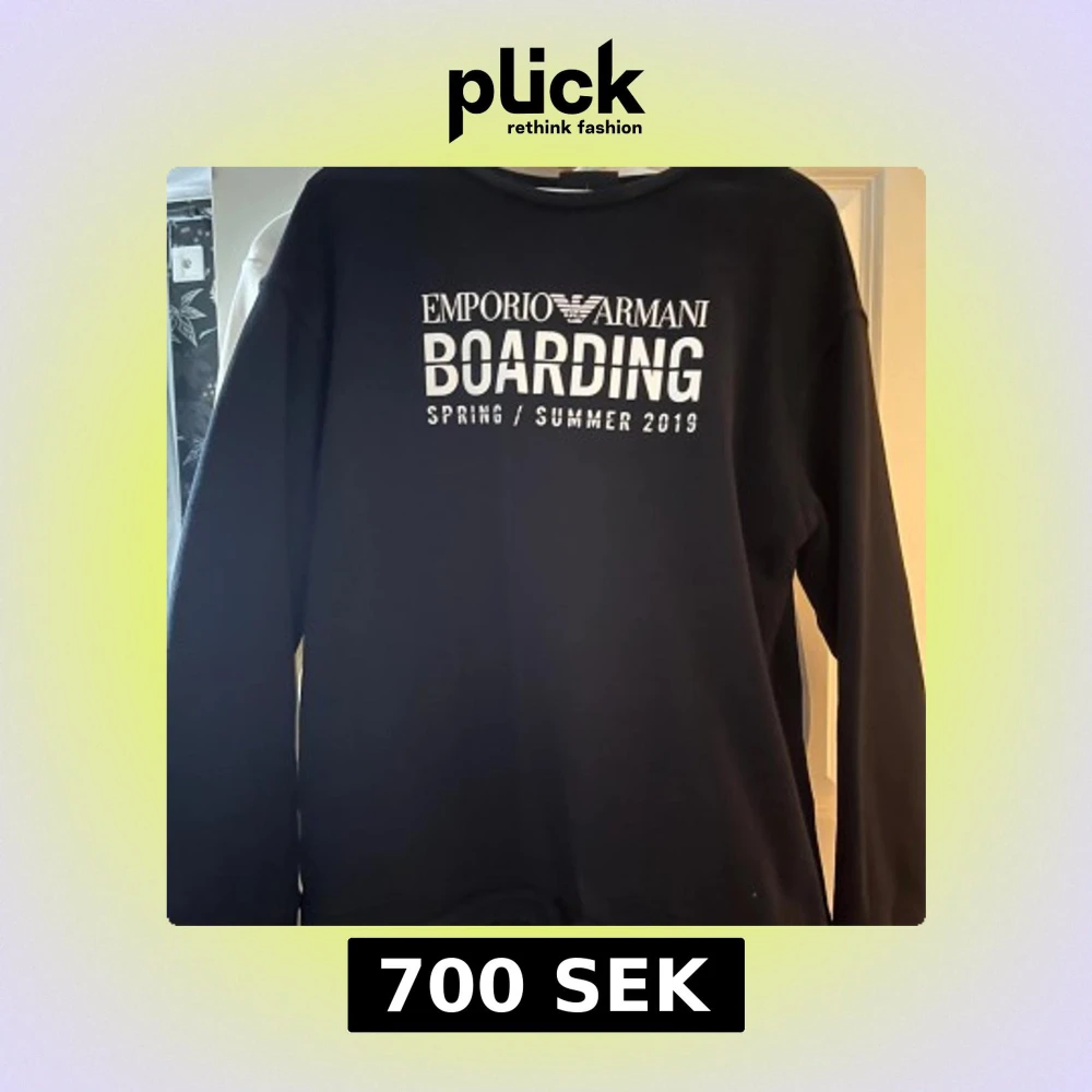 Svart sweatshirt från Emporio Armani med vit text 'BOARDING SPRING/SUMMER 2019' på bröstet. Klassisk rund halsringning och långa ärmar. Perfekt för dig som gillar stilrena och trendiga plagg med logga. Storlek M. Köpt för 3300 i Armanis egna butik i Italien.