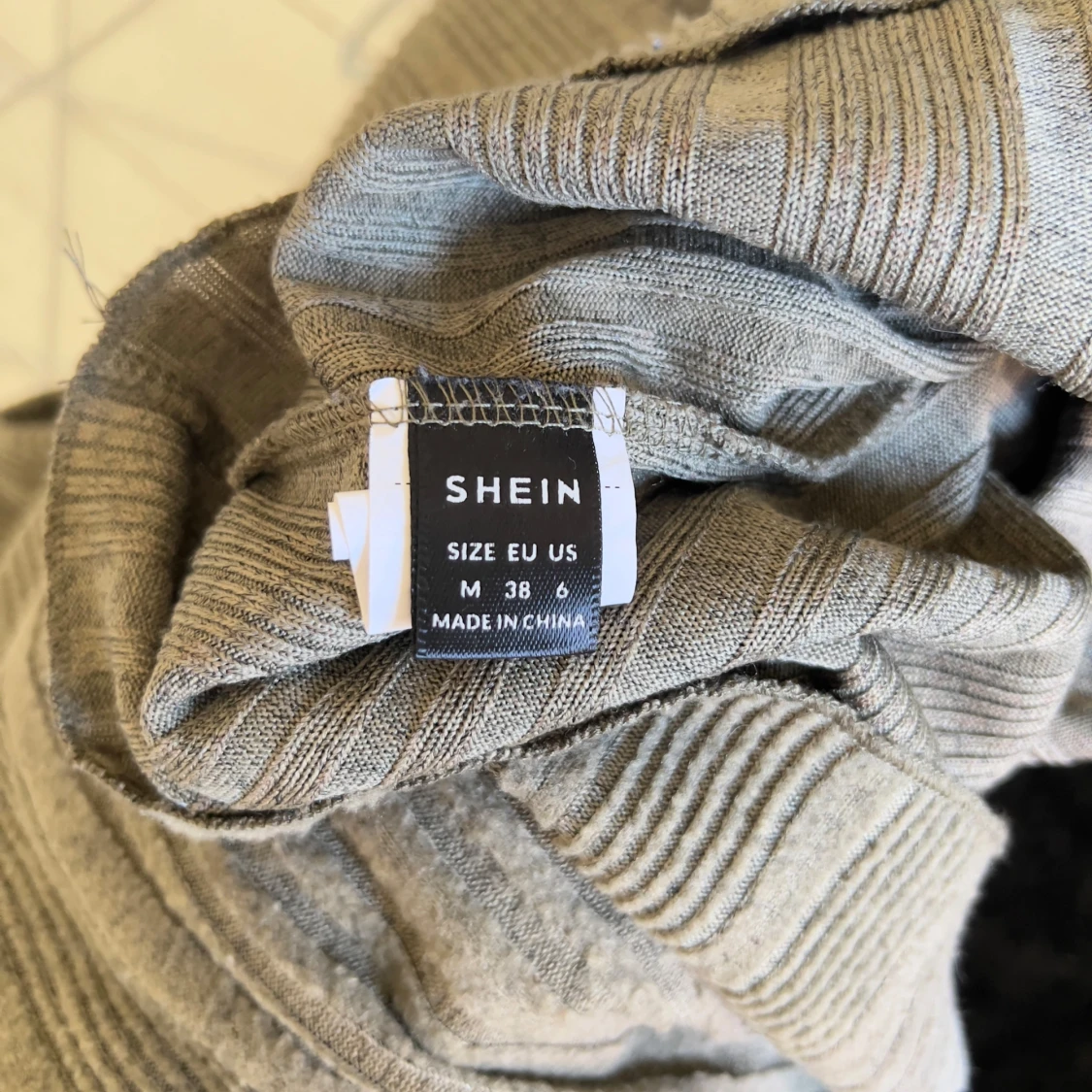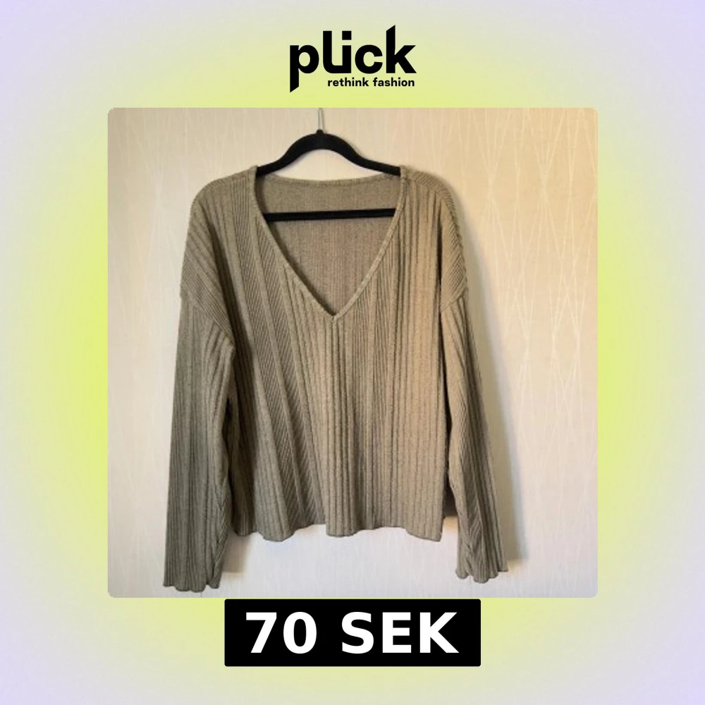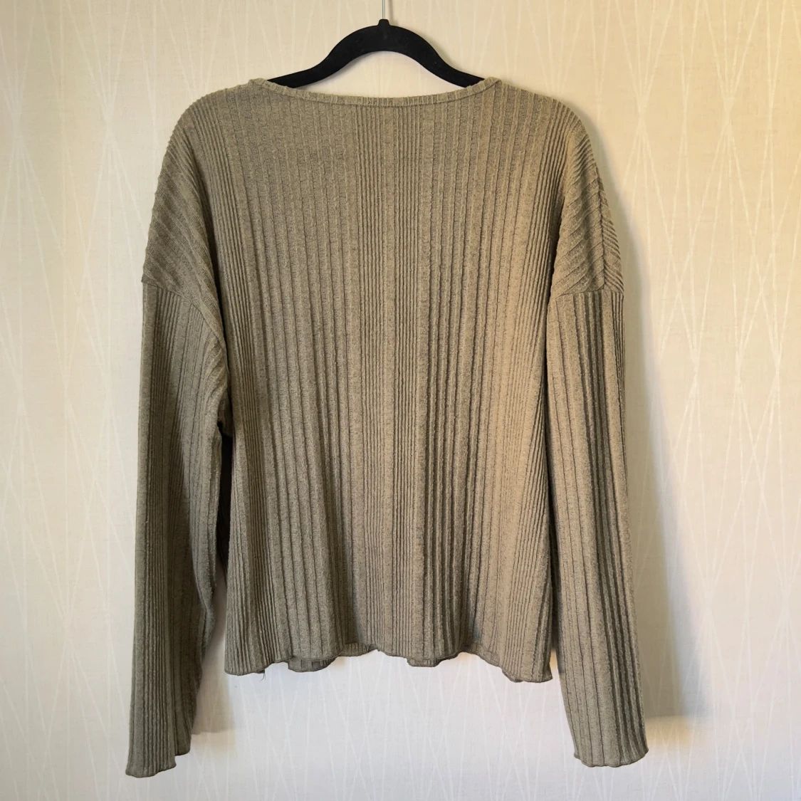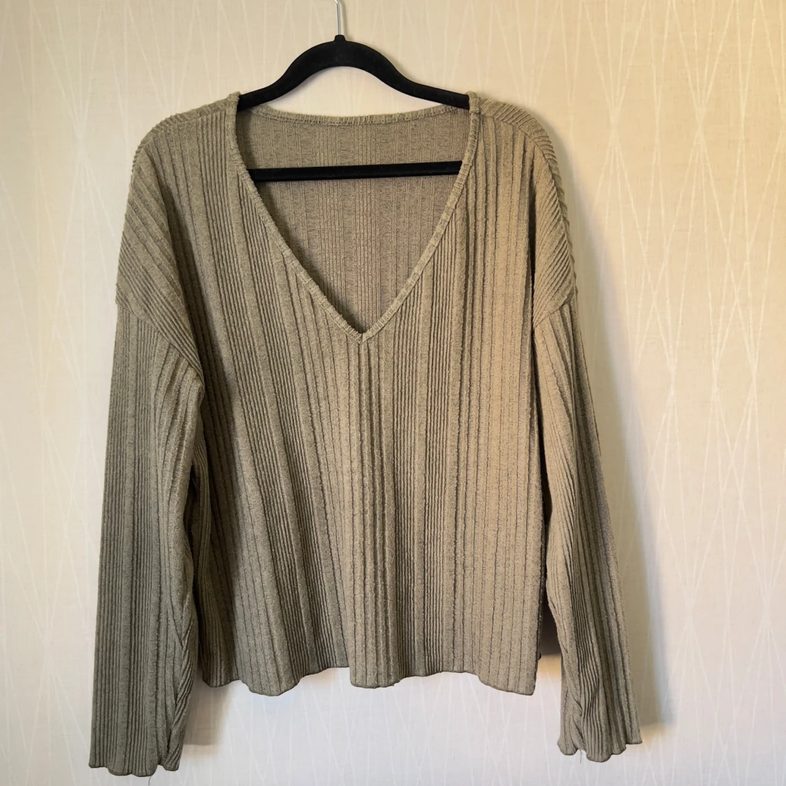 Ribbad hrön tröja i storlek M. Tröjan har v-ringning, lång ärm och en loose fit som ger en chill vibe. Perfekt för lager-på-lager och funkar till både jeans och kjol. Materialet är mjukt och stickat för extra komfort.