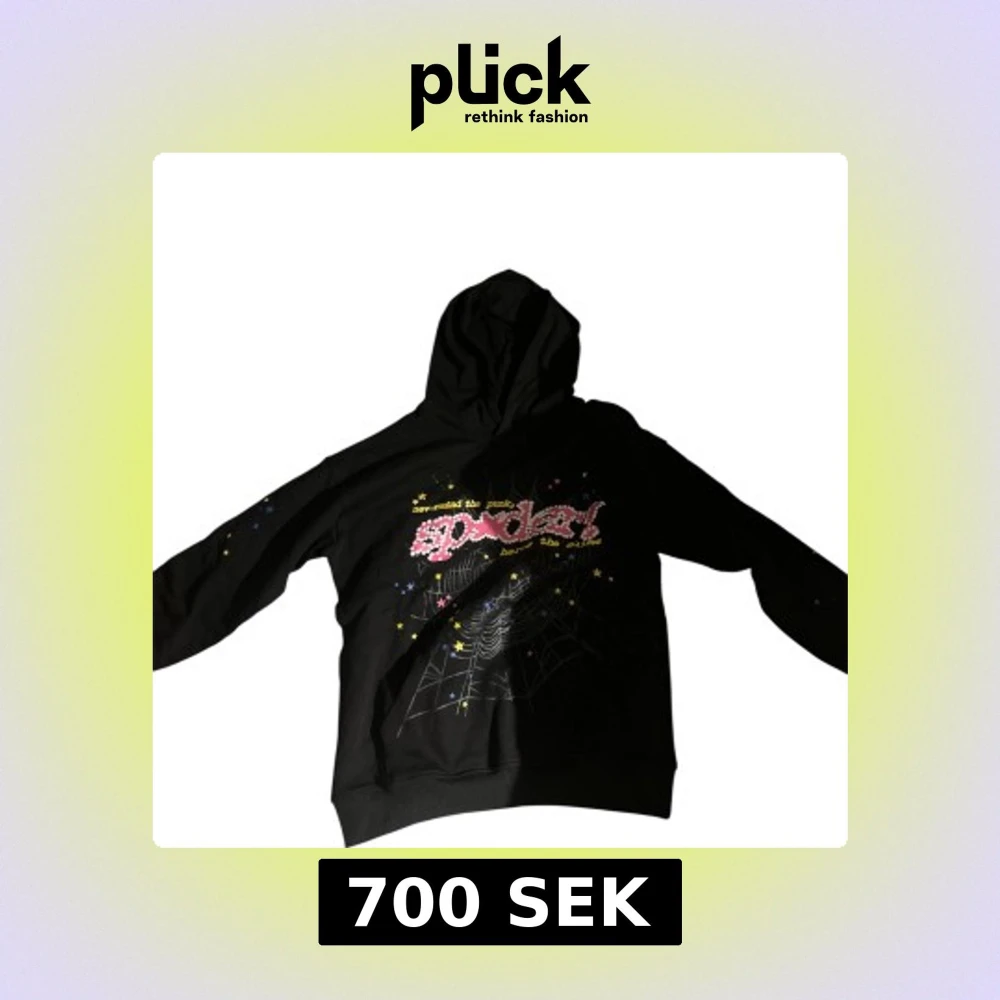 Svart hoodie från SP5DER med färgglatt tryck framtill, spindelnätsmotiv och stjärnor. Tröjan har huva och långa ärmar, perfekt för dig som gillar streetwear med unik design.