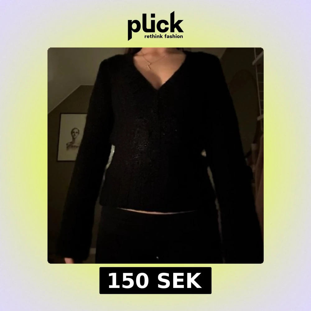 Säljer en svart stickad tröja med v-ringning. Tröjan har långa ärmar och en ribbad design som ger en snygg passform. Perfekt för kyligare dagar.