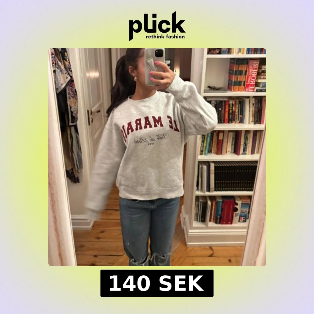 Säljer en grå sweatshirt från HM med Le Marais Paris med vinröd text framtill. Tröjan har rund hals, lång ärm och en loose passform. Så mysig!
