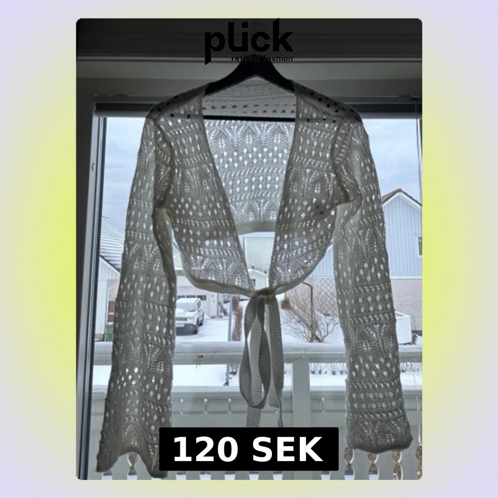 Säljer en vit virkad kofta med knytband framtill. Koftan har ett öppet hålmönster, vida ärmar och är croppad i modellen. Perfekt för lager på lager och ger en bohemisk vibe till din outfit.