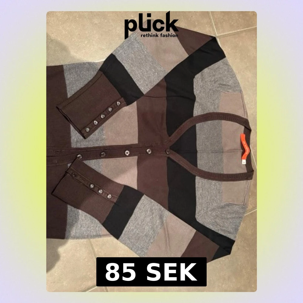 Snygg kofta med breda ränder i brunt, grått, beige och svart från 365 Sunshine. Långärmad modell med knappar framtill och vid ärmsluten. Mjuk och skön i stickad bomullsmix, perfekt för lager på lager under höst och vinter. Liten i storlek, en knapp saknar (se bild).