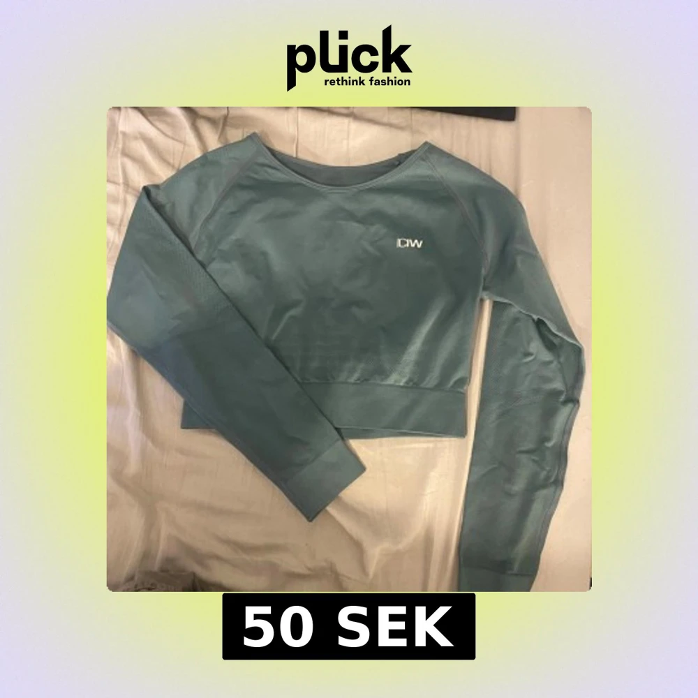 Säljer en snygg grön croppad tröja från ICANIWILL. Tröjan har långa ärmar och en stilren design med logga på bröstet. Perfekt för träning eller en avslappnad look.
