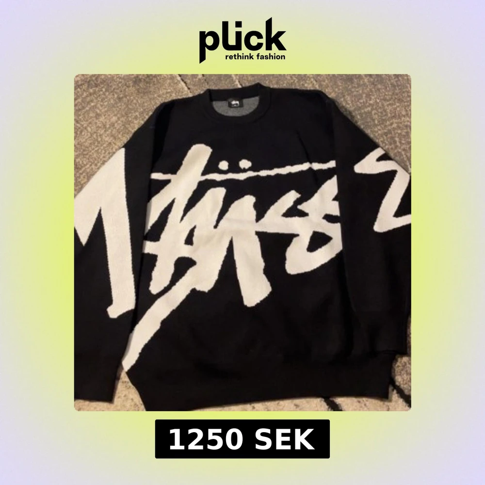 Säljer en cool svart tröja från Stussy med ett stort vitt grafiskt mönster över hela framsidan. Tröjan har långa ärmar och en rund halsringning. Perfekt för en avslappnad stil.