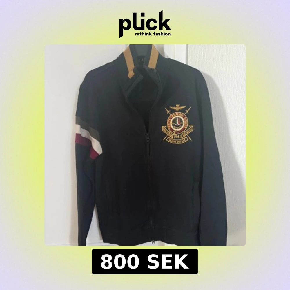 Säljer en svart jacka från Aeronautica Militare med broderad Frecce Tricolori-logga på bröstet och textdetaljer på insidan. Jackan har dragkedja, ståkrage med guldfärgade detaljer och randiga inslag på ena ärmen. Tröjan passa för storleks M.