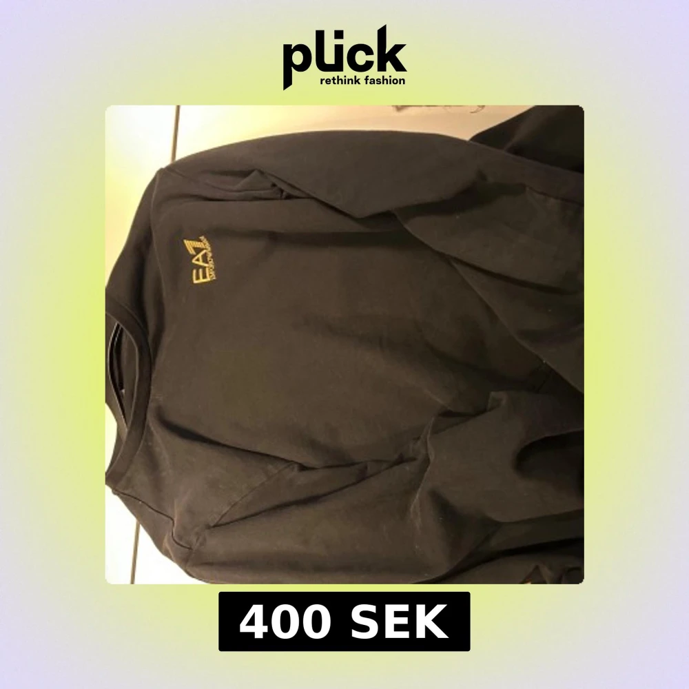 Svart långärmad tröja från EA7 Emporio Armani med guldfärgad logga på bröstet och dekorativa guldstreck på ryggen. Tröjan har en klassisk passform och är tillverkad i mjuk bomull.