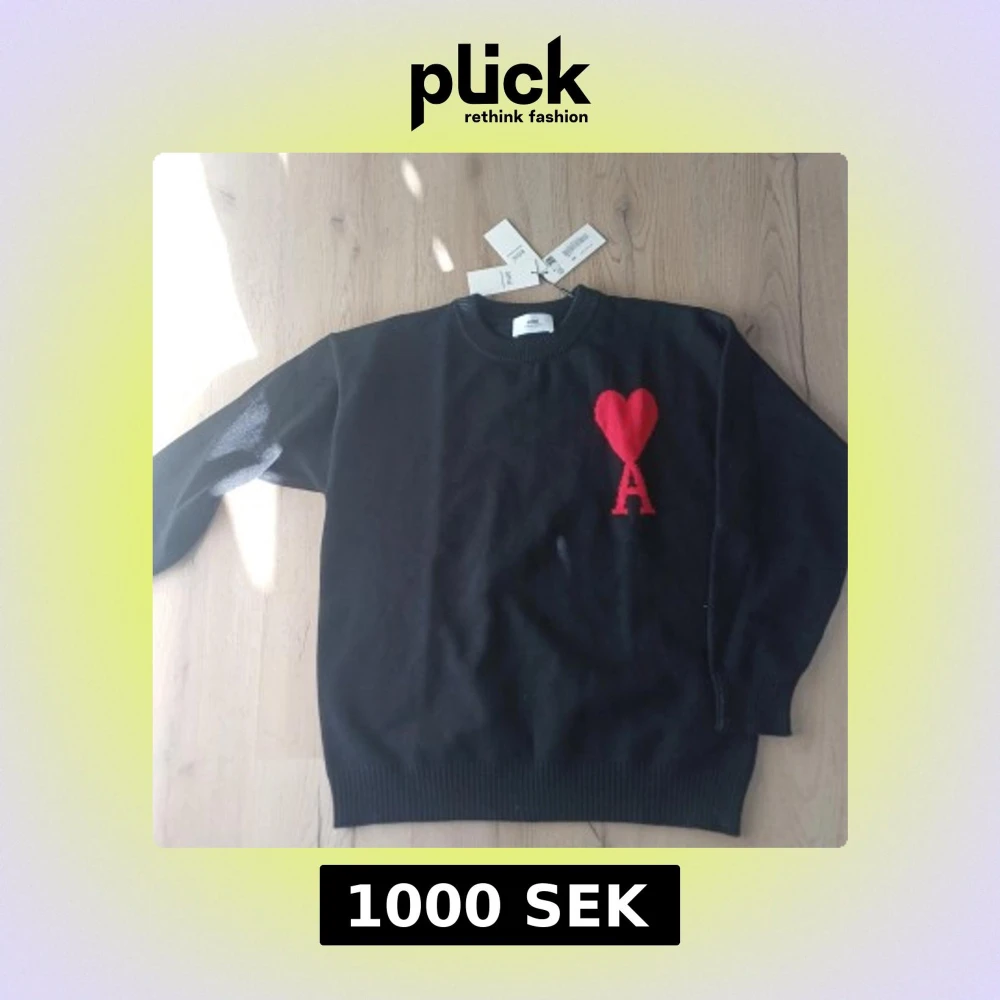 Säljer en stilren svart tröja från Ami Alexandre Mattiussi med ett rött hjärta och bokstaven 'A' på bröstet. Tröjan har långa ärmar och en rund halsringning. Perfekt för en trendig look.