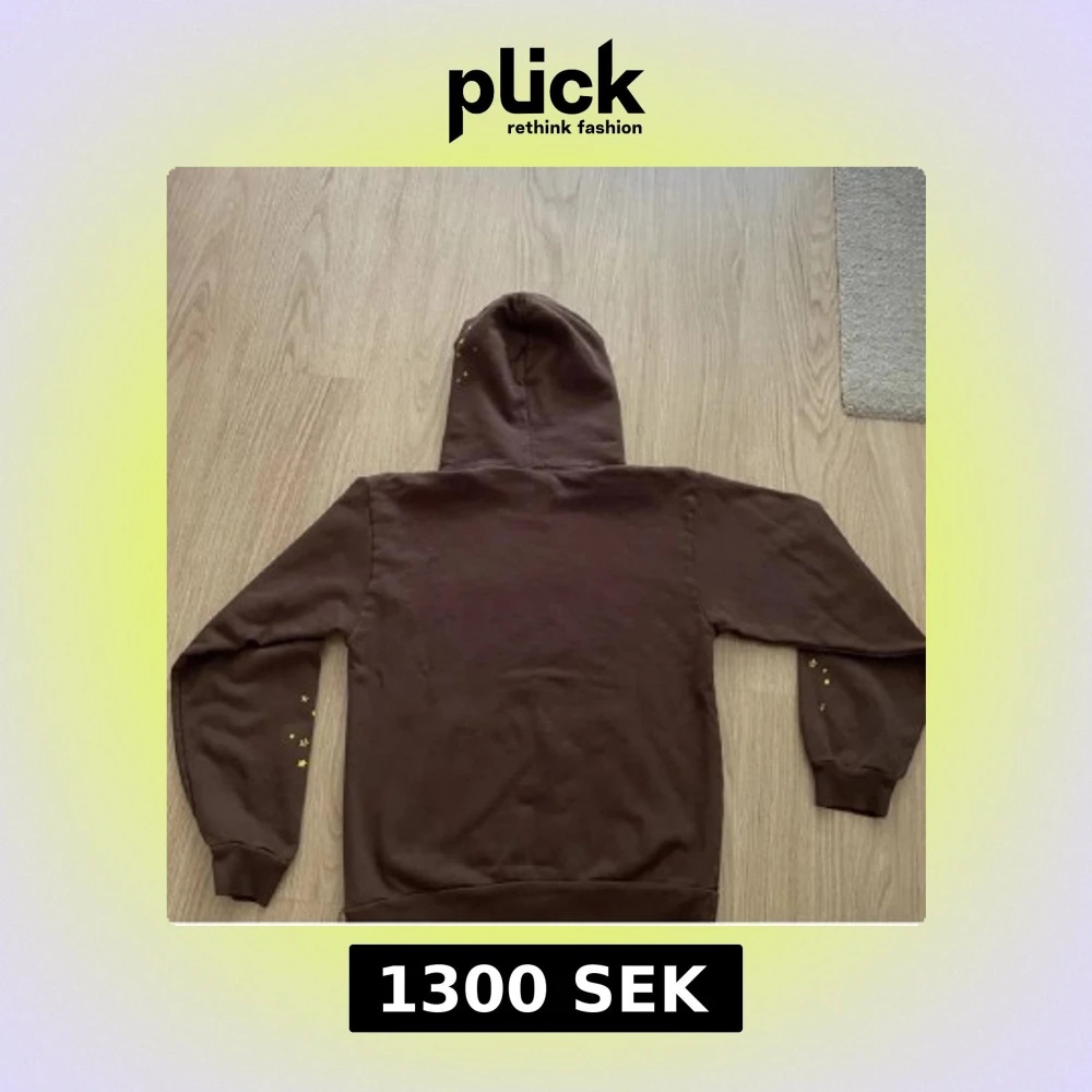Cool brun hoodie med en stor röd spindelnätsdesign och texten 'sp5der' på baksidan. Små gula stjärnor pryder ärmarna och huvan. Perfekt för en avslappnad stil.
