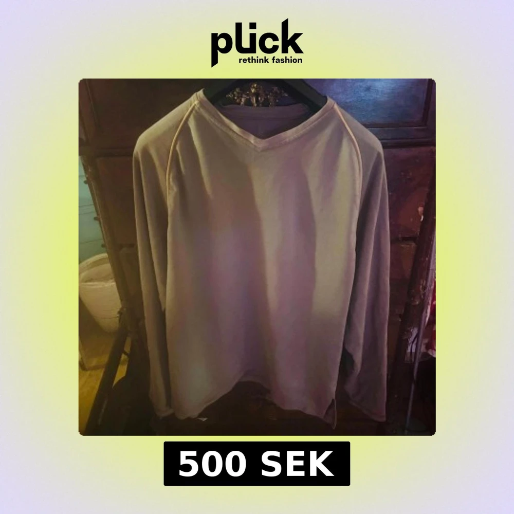 Säljer en beige långärmad tröja med v-ringning och diskret broderad KV-logga vid ärmslutet. Tröjan har en enkel och stilren design, perfekt för en avslappnad look.